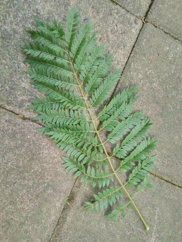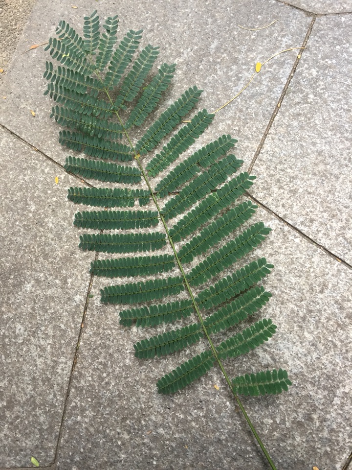 蓝花楹和凤凰木的叶子很相似,如果不开花,我曾经傻傻分辨不出哪棵树是蓝或凤,叶子在高处,看起来差不多。 小区绿道相隔不远有棵蓝有棵凤,蓝花楹的叶片不胜风吹,时常因风起掉下整片或半片树叶。再说不知为何,小鸟喜欢在蓝花楹及旁边的黄花风铃木上唧唧喳喳,当它们兴奋地倒饬的时候,树上就会掉下来整片及大半片叶,我用手机拍了下来。但是,凤凰木的叶子少见掉下来的。有一次终于看到半片叶子,拍下照片。把蓝和凤叶子图片放大比对,区别了然。虽都是羽状复叶,其复叶的小叶片顶端不同。之前我都作过植物笔记。