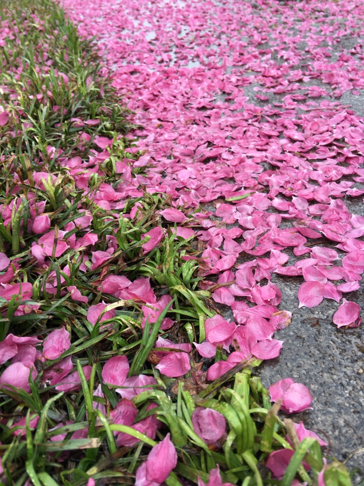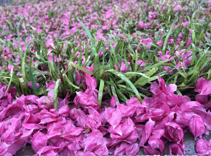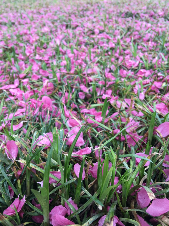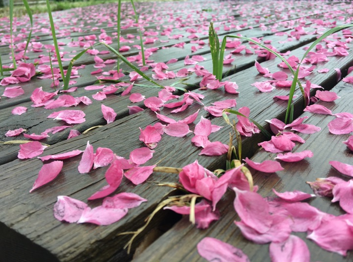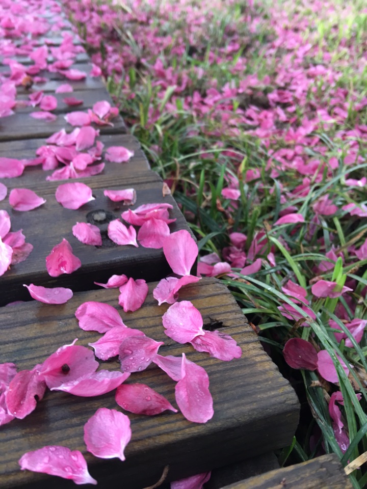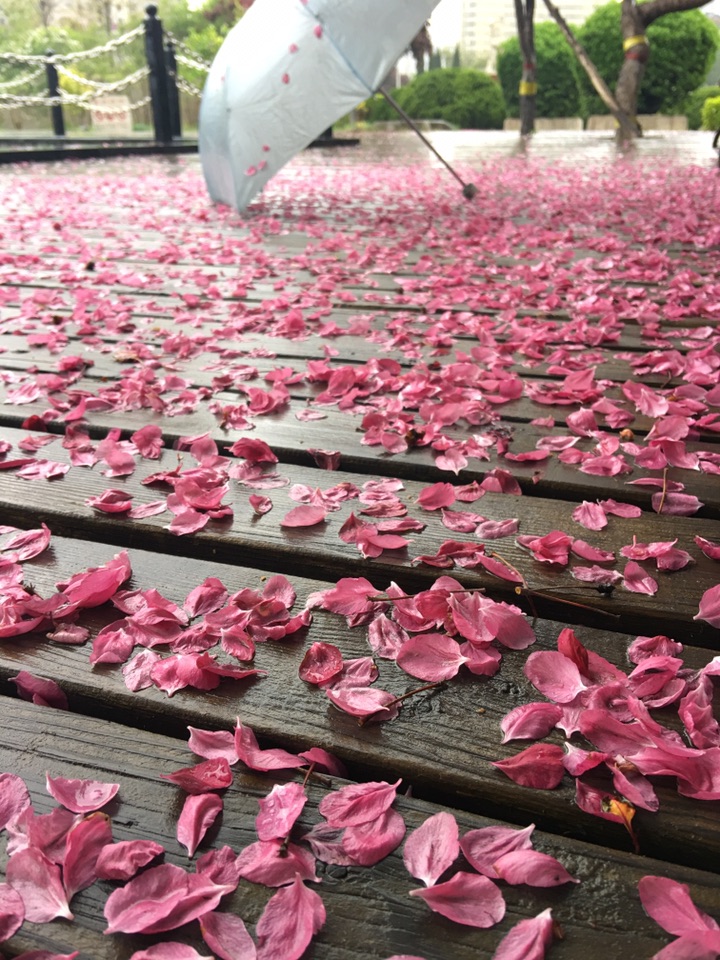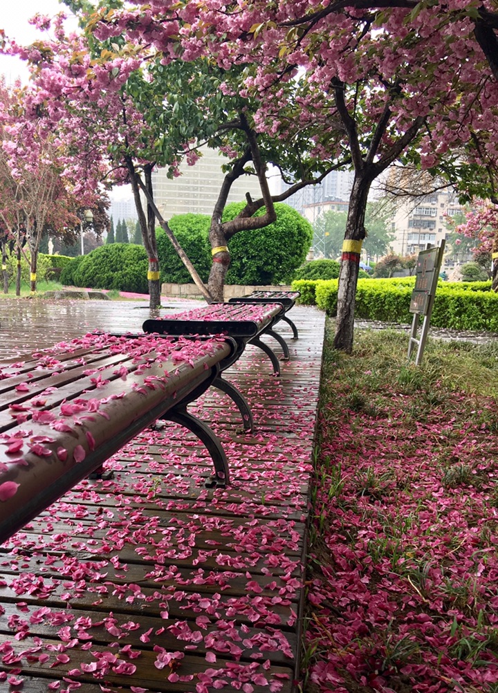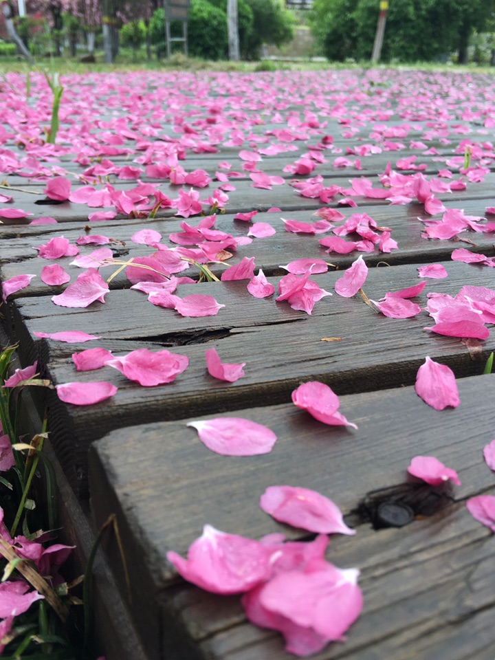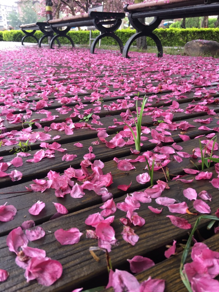 一场春雨,打落了许多北美海棠的花儿,花瓣落在草地上、水泥地上、木板上、座椅上,又成了一道风景,要不说落红不是无情物呢!😄