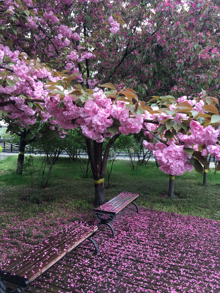 :最后一张照片的前景是晚樱,但“落红”都是北美海棠的花瓣😊