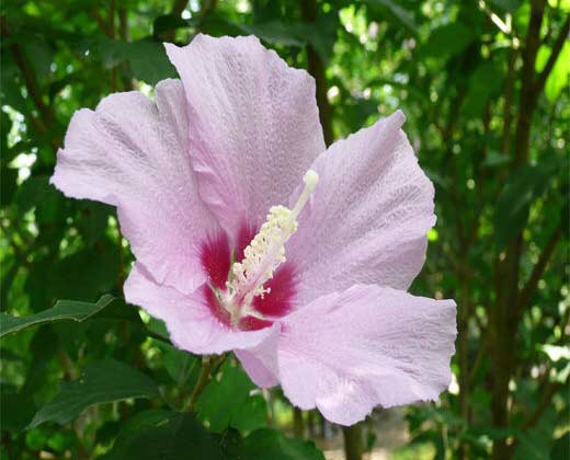 木槿花,像是仲夏夜的梦之花,朝开暮谢,却并不忧伤,似乎迎着纯净的阳光,含有欢喜,似乎朝暮不是一瞬,而是几十个日日夜夜的循环。艳丽的花融在绿叶里,和谐有致,是以高洁之姿,坐在你身旁。生活里,有幸遇到木槿女子,一路或者一车同行,一定要面朝晴天旷海,胸画十字,默默祈愿,让这样的好运长久相随着你,因为木槿里藏着的不仅有现实里的一瞬间,记忆里久远的美丽,还有我们时常期盼的永存幸福的祈祷。木槿,在植物里是大美女,在《诗经》里也一样是大美女。