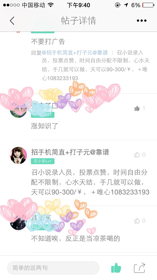 大家在微信QQ上都见到过招打字员,招兼职之类的广告吧,好嘛,现在连形色话题回复都有广告了,大家看吧