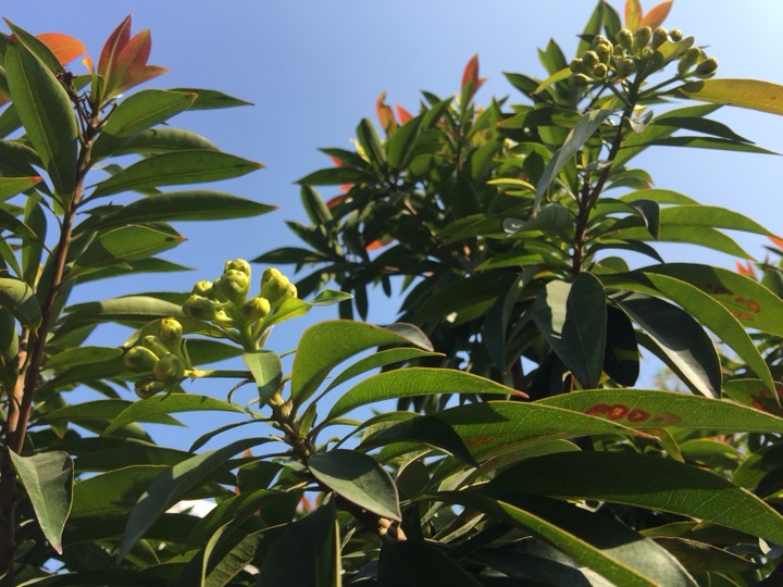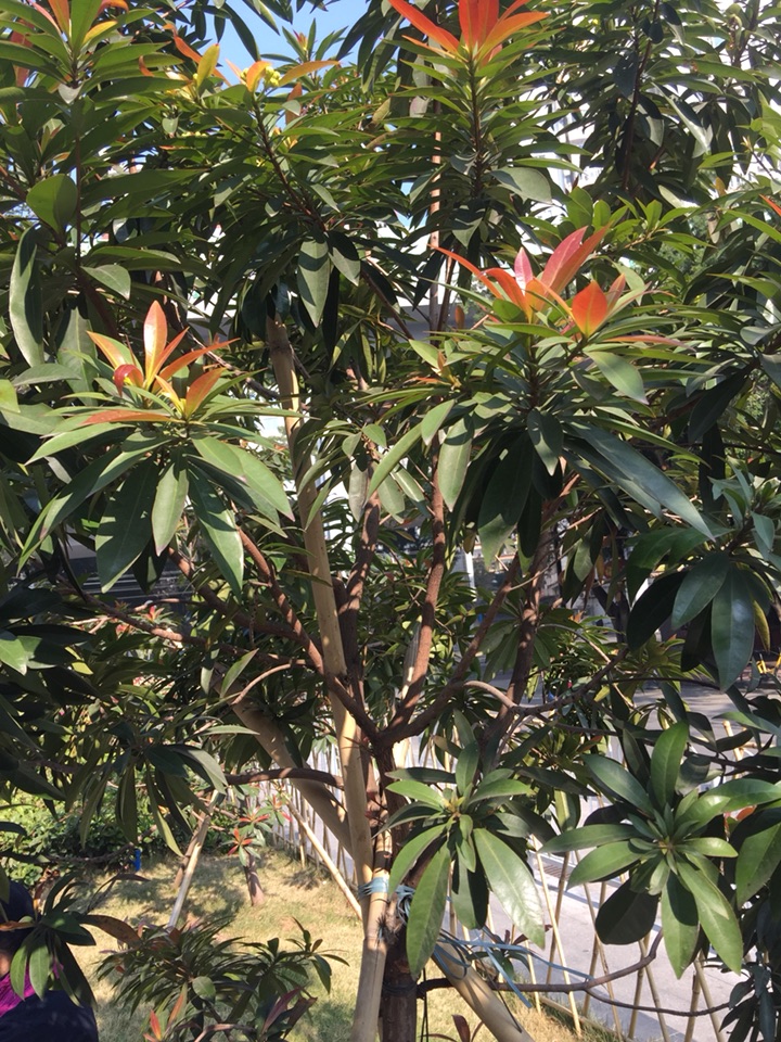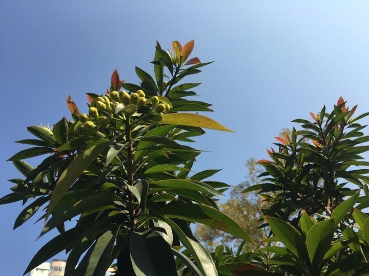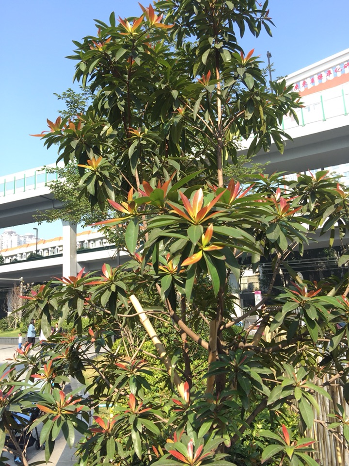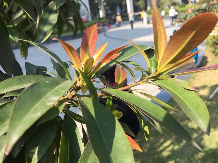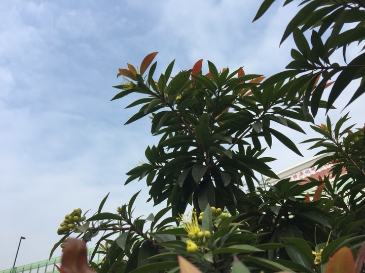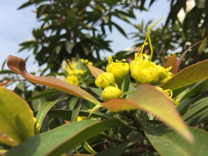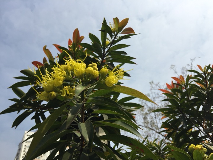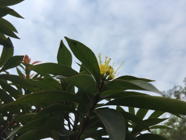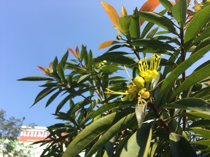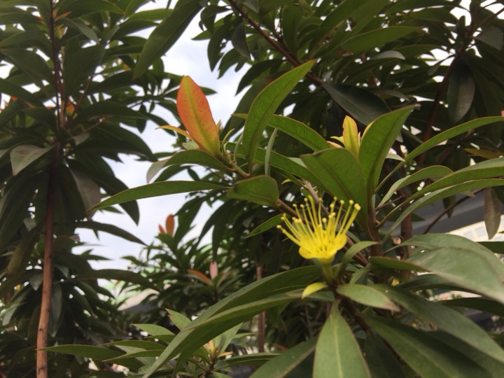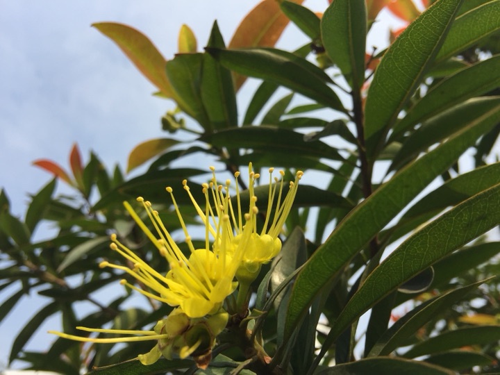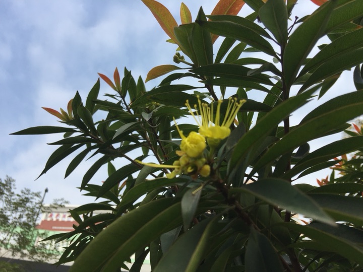 附近的一个社区医院,外面的绿化带也就是这一两年搞好的。前几天经过那里,被几棵树吸引住了。由于阳光充足,看得出来护理又好,叶子红绿油润。以为可能是人心果树,但树型却又略胜一筹。对着叶子拍照识别是什么树,好几个答案呀。再看树梢上有黄花开,花叶入框的照片,识别是金蒲桃。觉得对路,一查,准确!网上的资料图片,满树黄花盛开的金蒲桃树,不由得你不说一个字:美!我过几天后再去看看,花亮眼过之前了。