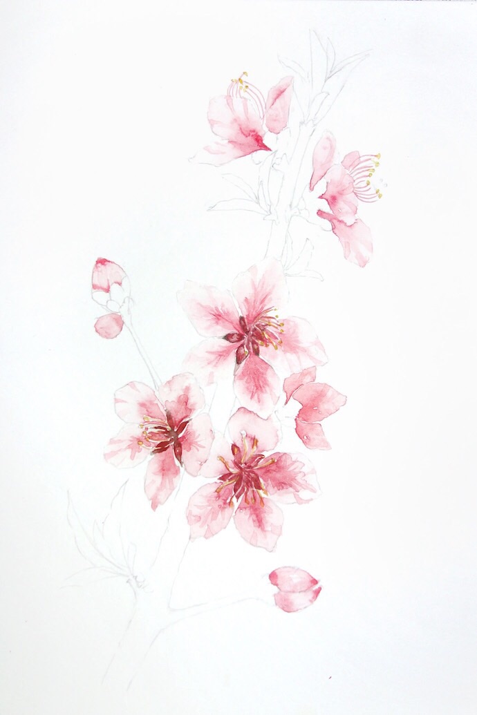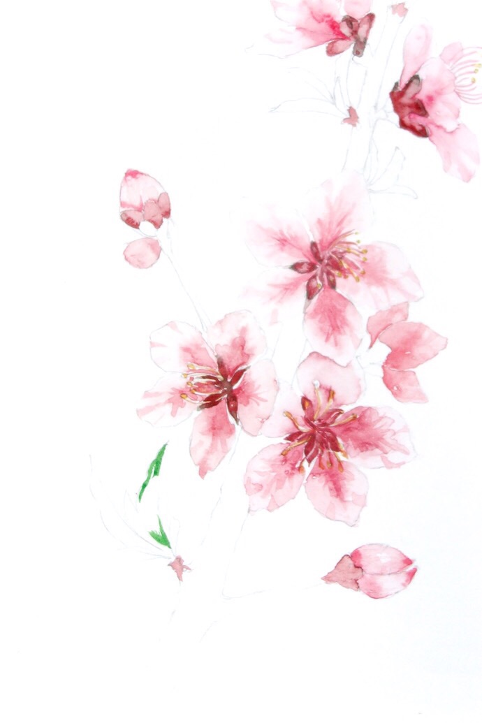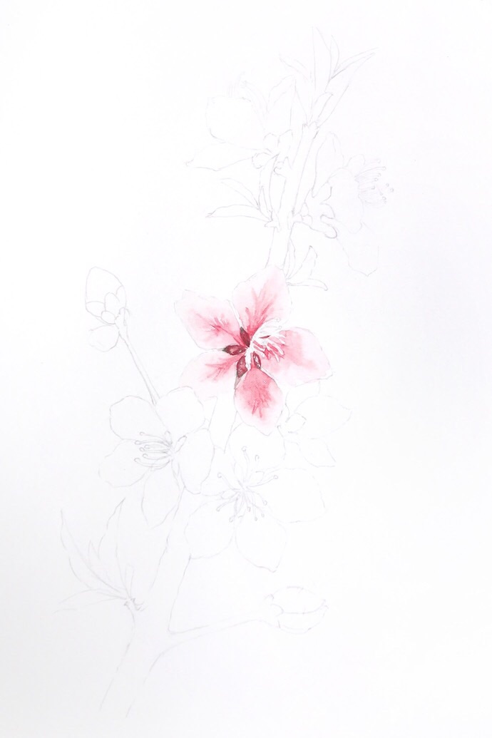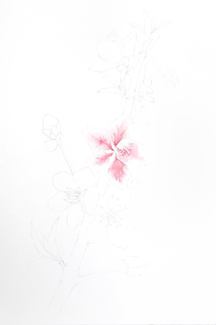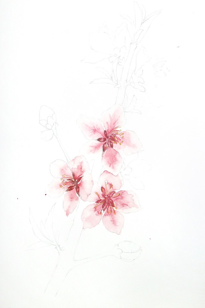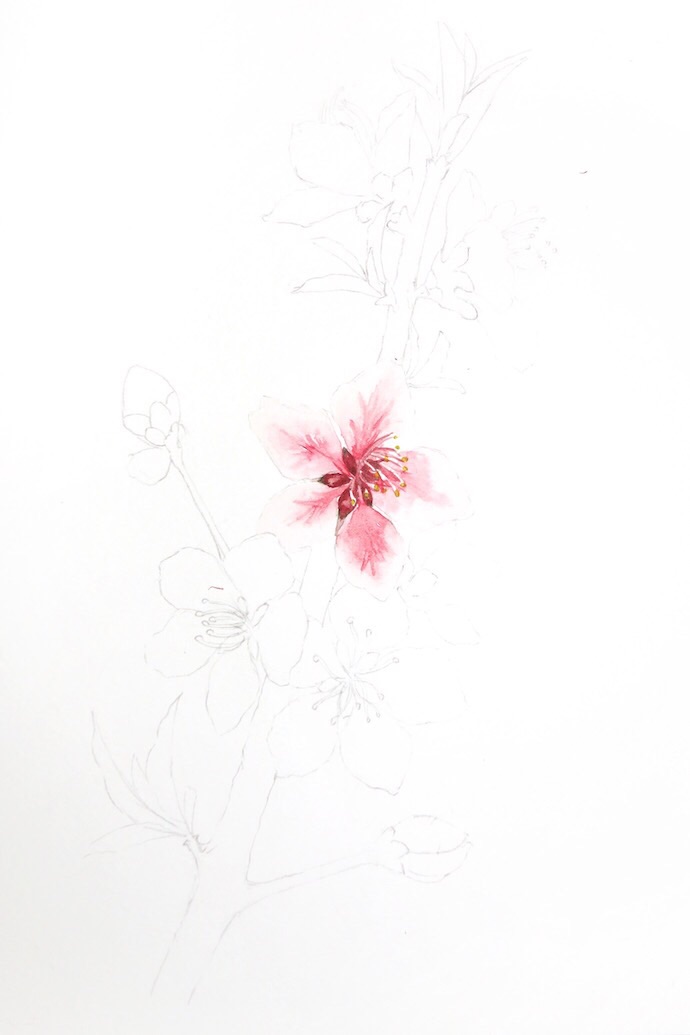 大红加少许紫色由花朵根部向外画扇形,然后用干净的笔蘸清水将颜色向边缘晕染开来。