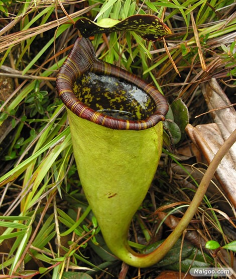 巨型猪笼草学名“Nepenthes attenboroughii”,是在菲律宾维多利亚山海拔5000英尺(约合1524米)的地区发现的。这种肉食植物能够分泌一种类似花蜜的物质,引诱没有疑心的猎物主动进入一个酶和酸的“死亡之池”。一系列充满粘性的下垂主叶脉让掉入陷阱的猎物成功逃走的想法化为泡影。