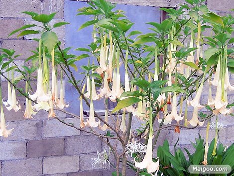 “天使的号角”学名“Brugmansia”,是植物王国最有可能让人变成僵尸的可怕家伙。这种植物会开出美丽而下垂的喇叭花,原产自南美洲,含有一系列强大的毒素、颠茄碱、天仙子胺以及车莨菪碱。