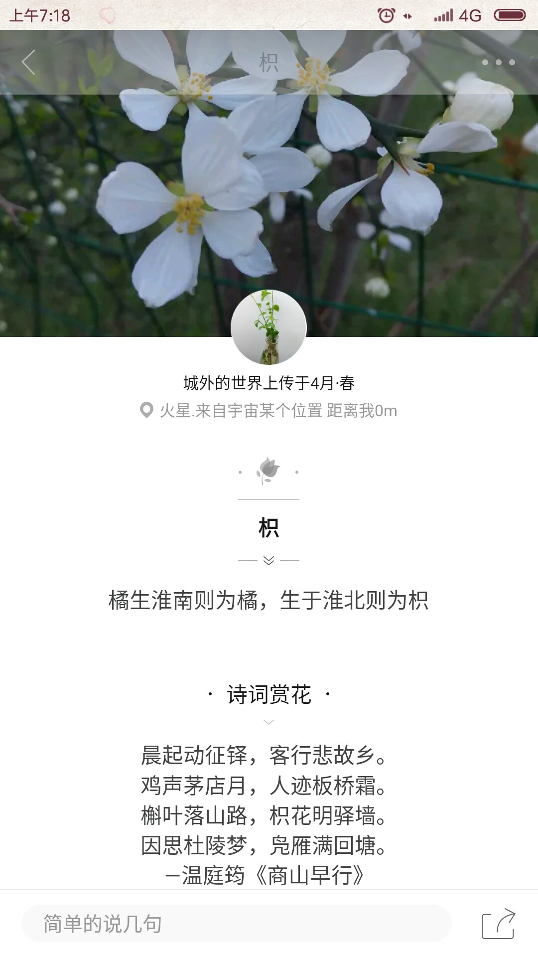 可能人与花也是有某种特别的缘分,下班竟然一路顺利,早早的就下了车。路过枳树的时候天还没有暗下来,于是心中暗喜,愉快的度过了一个与枳畅谈的傍晚。