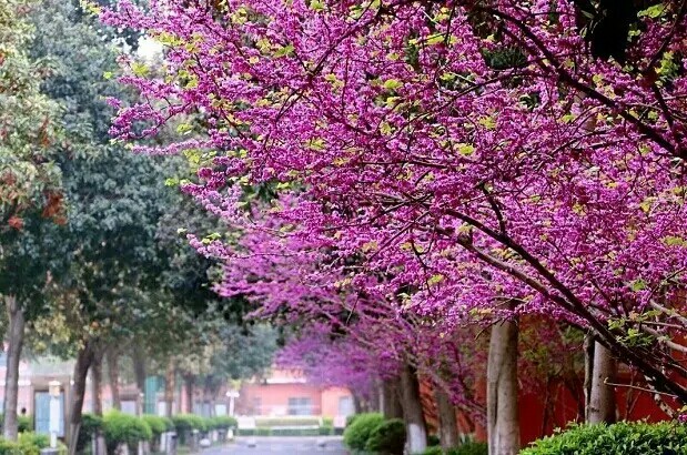 紫荆,豆科紫荆属植物。明·李时珍《本草纲目》“其木似黄荆而色紫,故名。”3-4月开花,花紫红色或粉红色,簇生于老枝和主干上,尤以主干上花束较多,越到上部幼嫩枝条则花越少,通常先于叶开放,但嫩枝或幼株上的花则与叶同时开放。