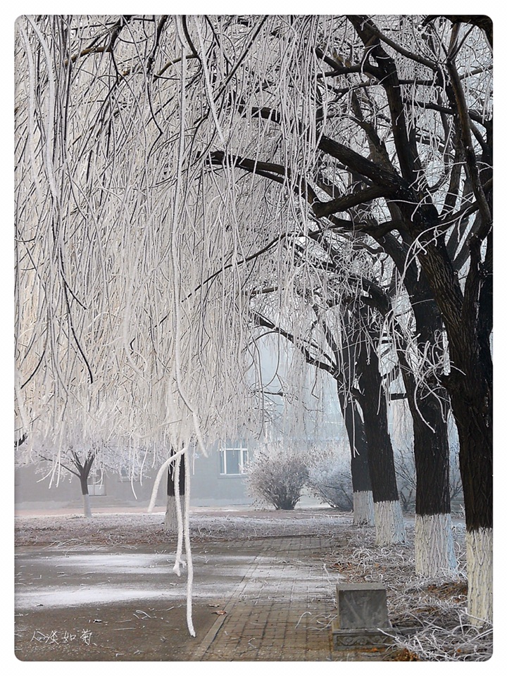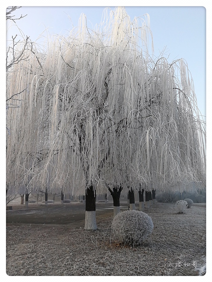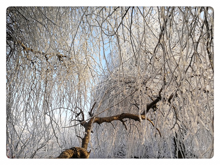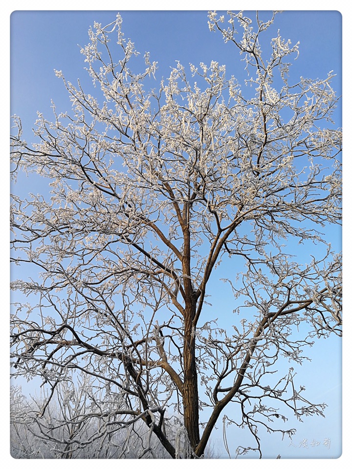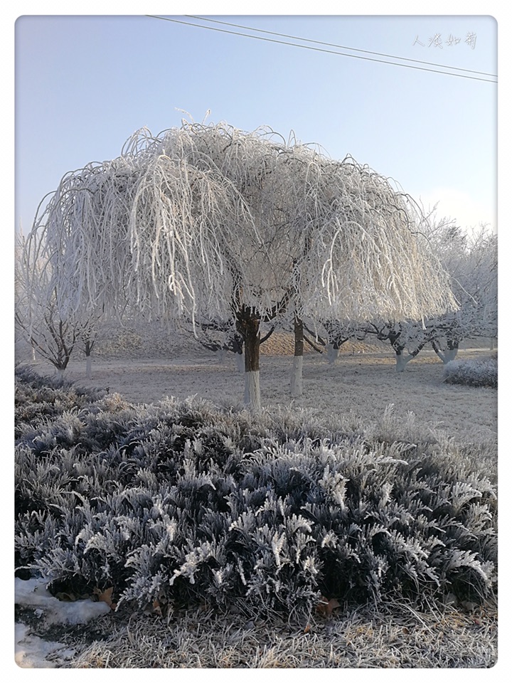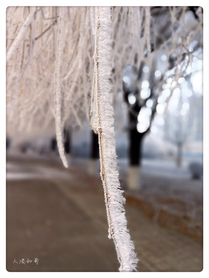 早上,漂亮的树挂装饰了东北冬季光秃秃的树枝,杨柳榆槐、杏梨李桃,高高低低、松松密密的枝条上均挂满洁白的雾霜,这转瞬即逝的美景调亮了心情!