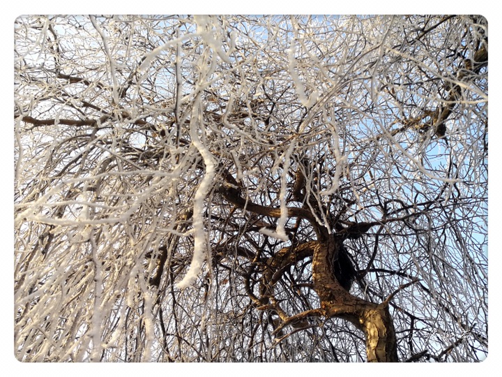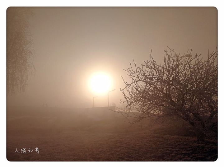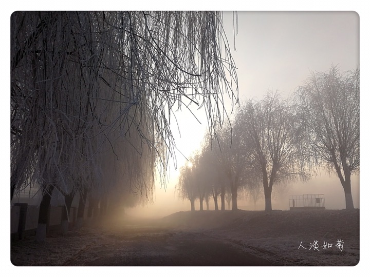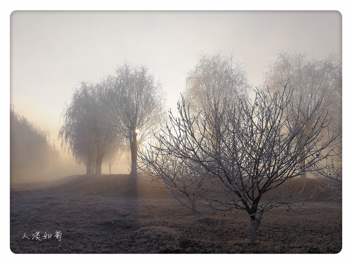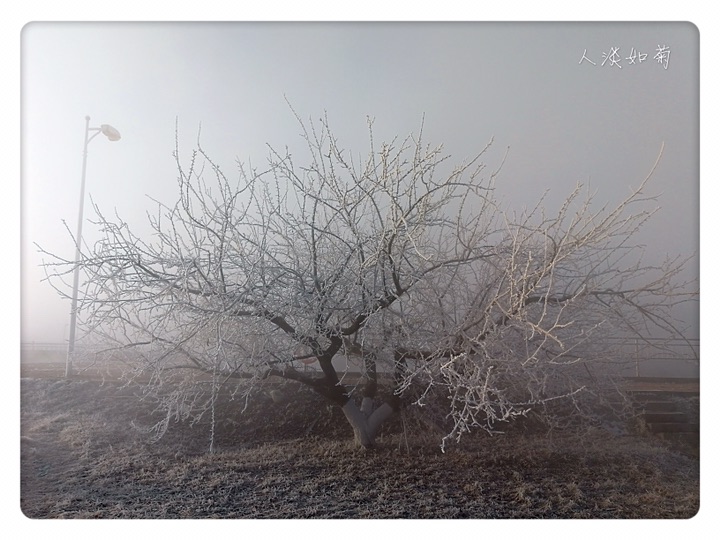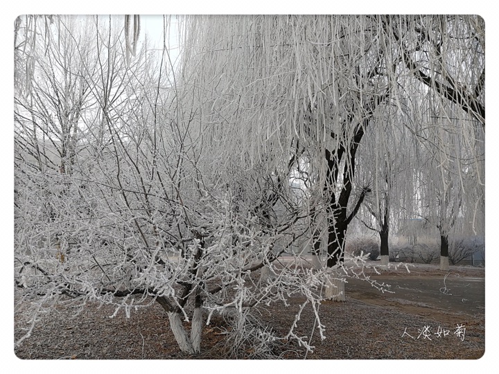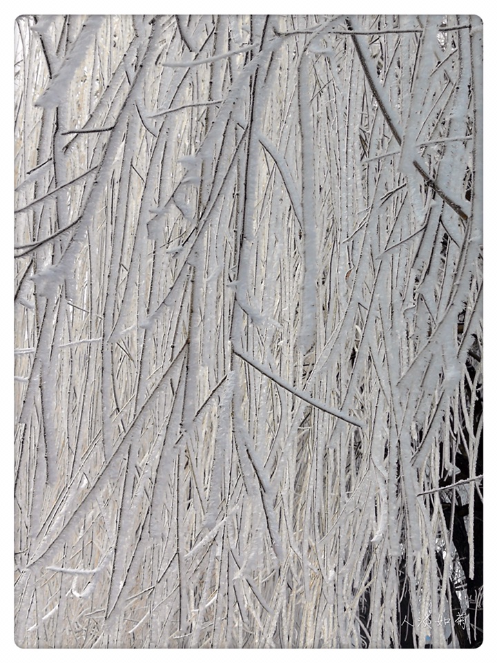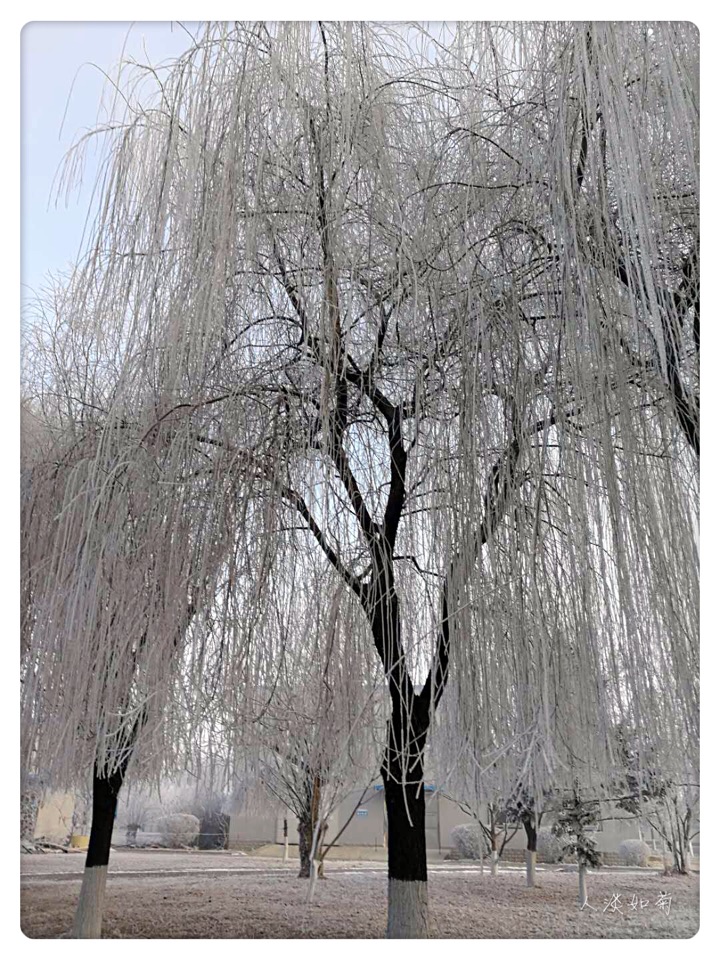 早上,漂亮的树挂装饰了东北冬季光秃秃的树枝,杨柳榆槐、杏梨李桃,高高低低、松松密密的枝条上均挂满洁白的雾霜,这转瞬即逝的美景调亮了心情!