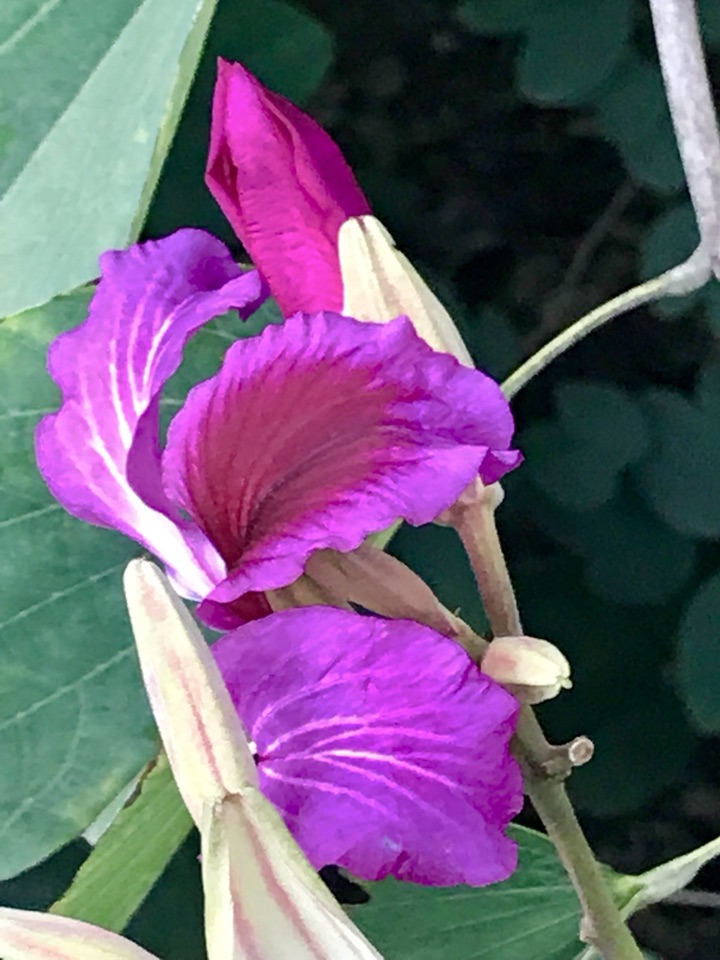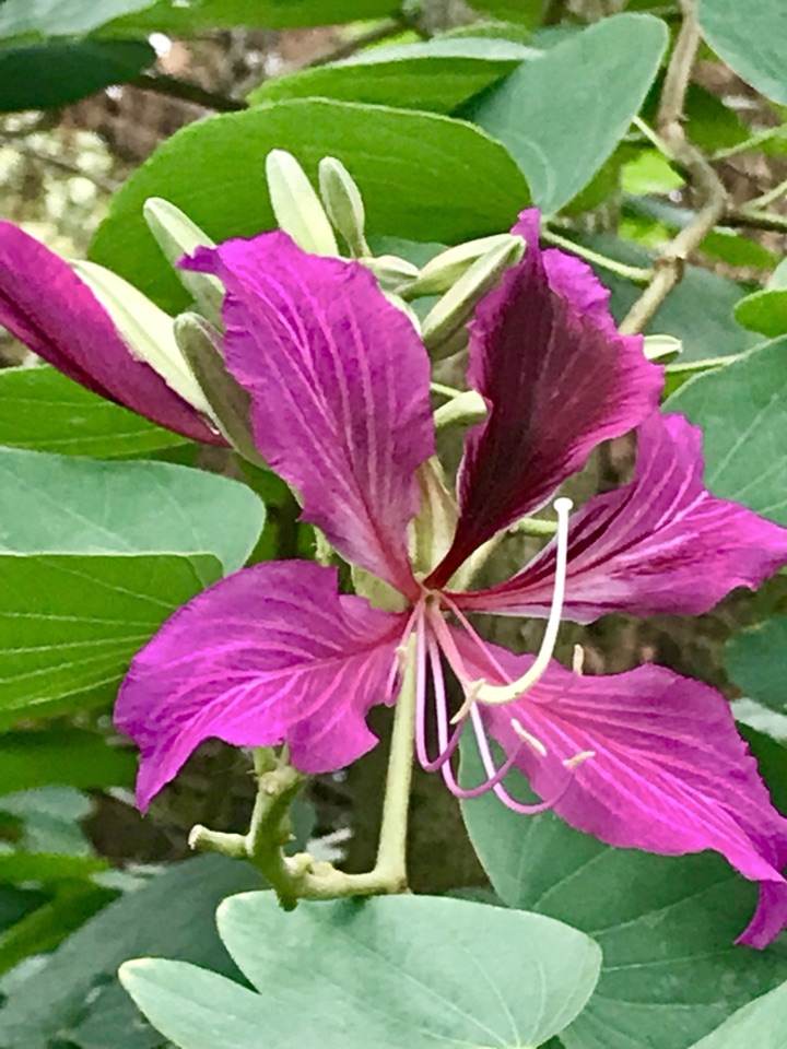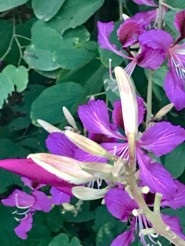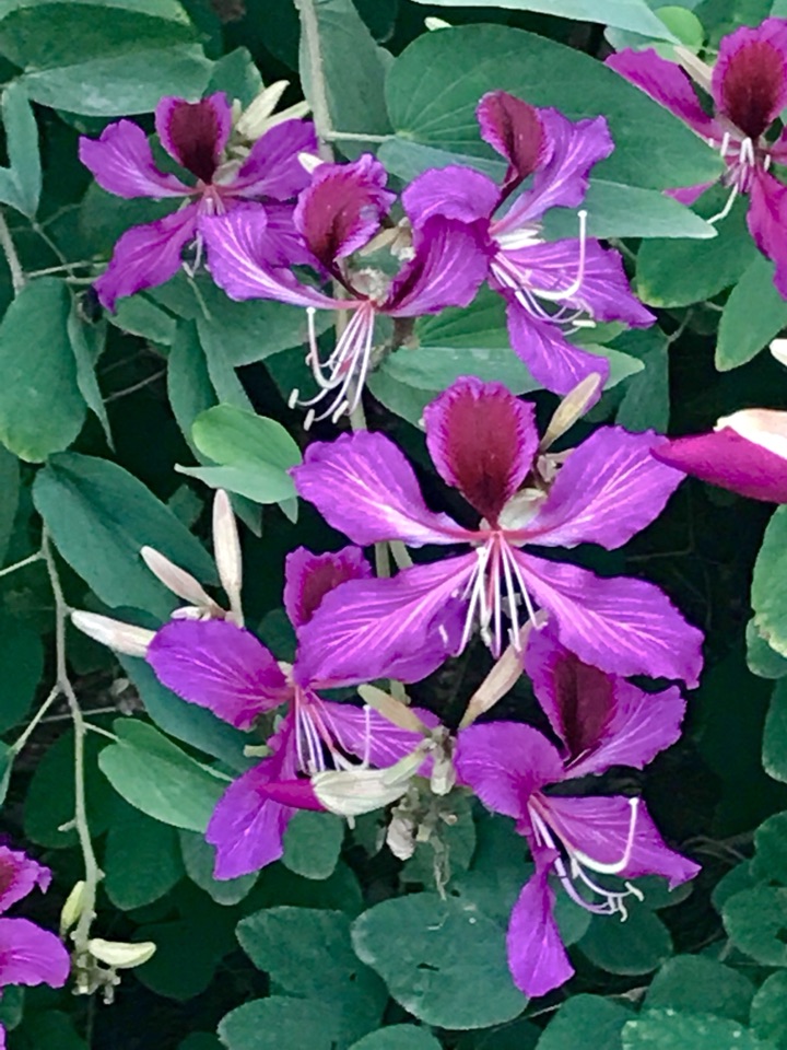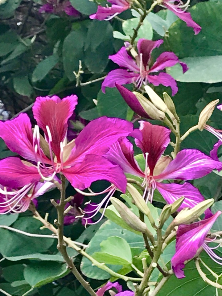 树下一群大妈统一的穿着如紫荆花般艳丽的衣裳,脸上扑着厚厚的粉,眼皮上粘着长长的假睫毛,朔胶质感,用小孩子的话说像“曱甴腿”,变成两层睫毛,一瞥惊到,也难怪,眼花了,手也不那么巧了,年轻的时候又没弄过不熟练,描了眉,画了眼线,施了眼影、胭脂,涂上了口红,倒是化妆程序一样没少,精心打扮,努力的想要摆出芭蕾舞剧《天鹅湖》中,四小天鹅的舞姿,尽力地展现出优美的姿势,在拍照,想留下美丽的倩影,尽管上身的曲线已走了样,而腿有了弧度,仍然尽量的挺着,尽量的拔着。