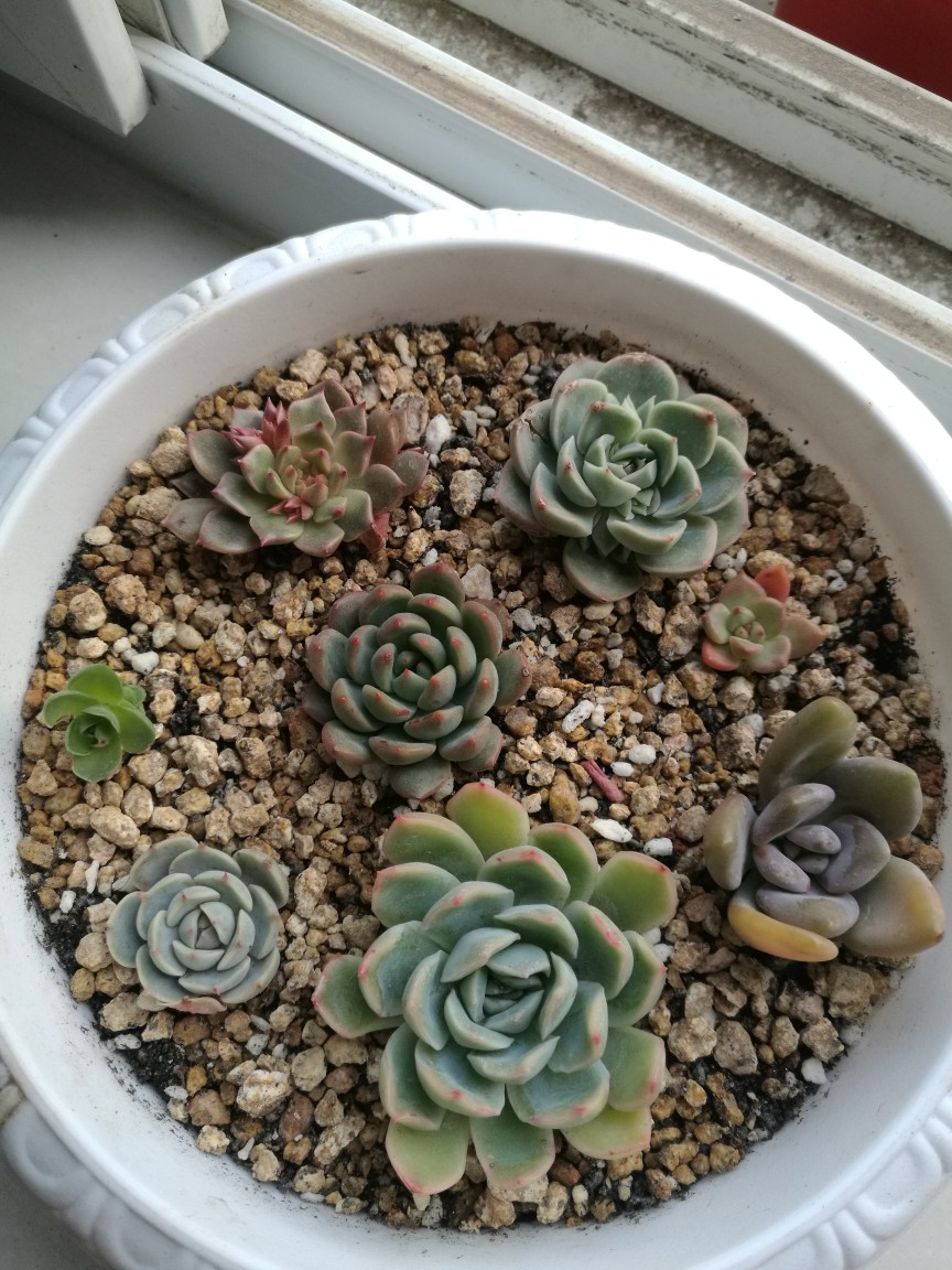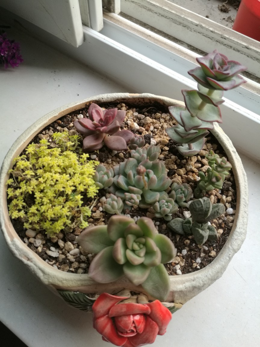 大拼盘之一:依次是黄丽,黄金万年草姬胧月,星王子,小米星,鹿角海棠,中间的是爆崽的子持白莲,还长出了花箭。鹿角海棠严重缺水,被我拔出来重新种下,星王子和小米星也刚被砍了头,只为多冒新头,也可以长一盆