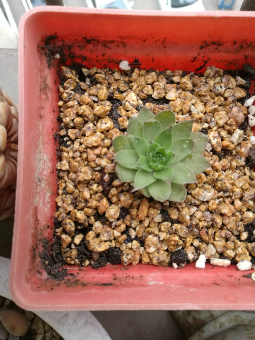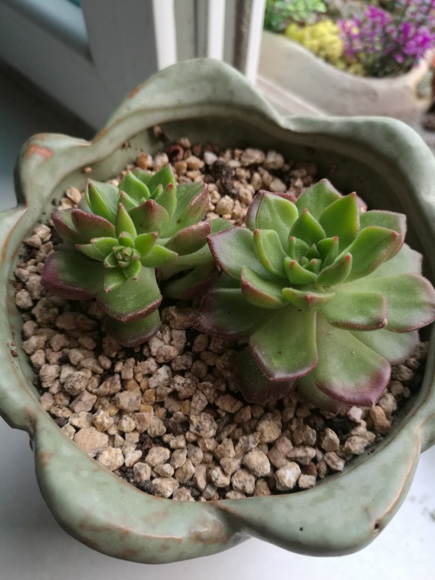 观音莲,同事那里掐来两棵,同时种下,其中一个根没长好,后来重新换土换盆总算活过来,但是两个个头一大一小很明显,大的下面开始冒小头了