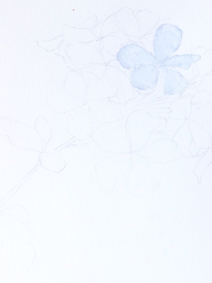 用干净的毛笔加普蓝加少许紫,多蘸水,铺花瓣的底色。