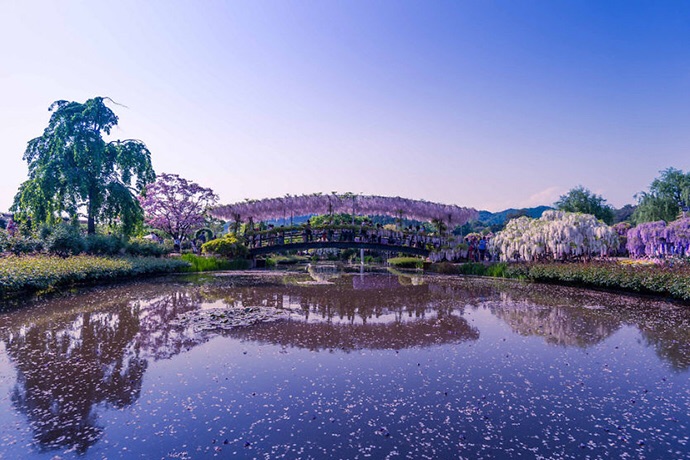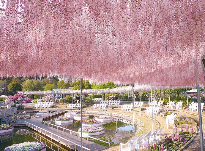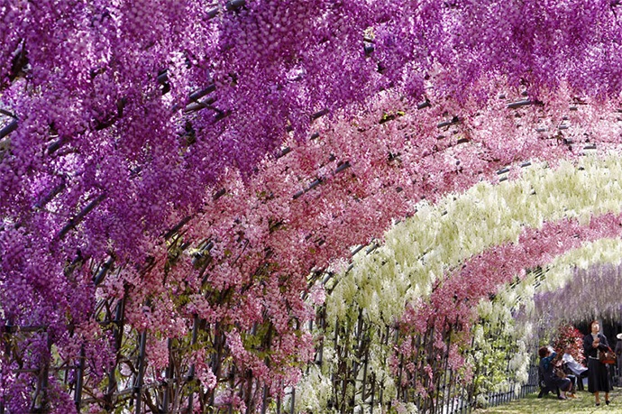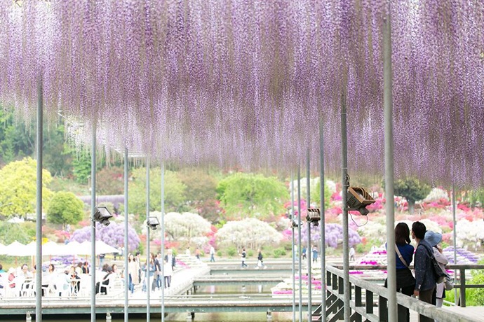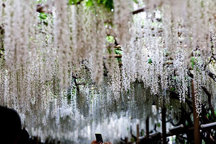 Ashikaga公园中还有一条长达80米的白花紫藤隧道,纯洁的花穗像瀑布一样倾斜而下,周围萦绕着淡雅的香气,如同置身在梦幻世界。