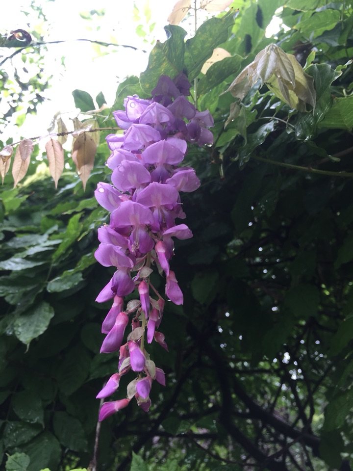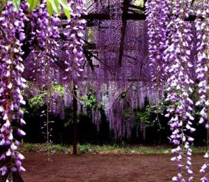 紫藤花有个古老而美丽的传说:有一个美丽的女孩想要一段情缘,于是她每天祈求天上的红衣月老能成全。终于红衣月老被女孩的虔诚感动了,在她的梦中对她说:“在春天到来的时候,在后山的小树林里,她会遇到一个白衣男子,那就是她想要的的情缘。”等到春暖花开的日子,痴心的女孩如约独自来到了后山小树林。等待她美丽的情缘--白衣男子的到来。可一直等到天快黑了,那个白衣男子还是没有出现,女孩在紧张失望之时,反而被草丛里的蛇咬伤了脚踝。女孩不能走路了,家也难回了,心里害怕极了。在女孩感到绝望无助的时刻,白衣男子出现了,女孩惊喜地呼喊着救命,白衣男子上前用嘴帮她吸出了脚踝上被蛇咬过的毒血,女孩从此便深深地爱上了他。可是白衣男子家境贫寒,他们的婚事遭到了女方父母的反对。最终二个相爱的人双双跳崖徇情。在他们徇情的悬崖边上长出了一棵树,那树上居然缠着一棵藤,并开出朵朵花坠,紫中带蓝,灿若云霞。后人称那藤上开出的花为紫藤花,紫藤花需缠树而生,独自不能存活,便有人说紫藤就是女孩的化身,白衣男子就是树的化身,紫藤为情而生,无爱而亡。