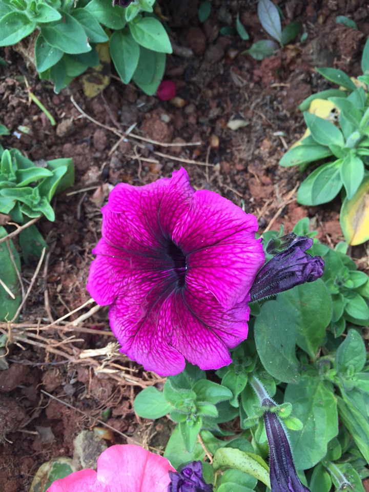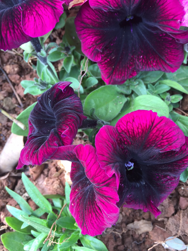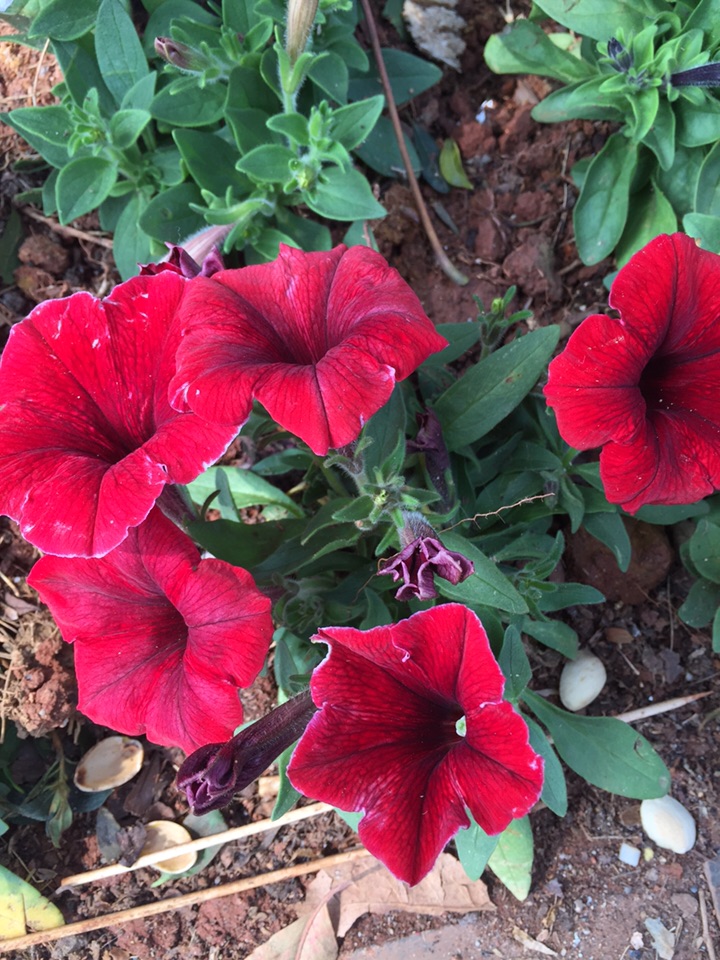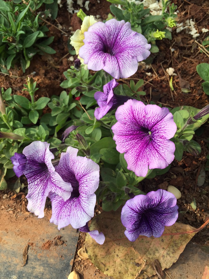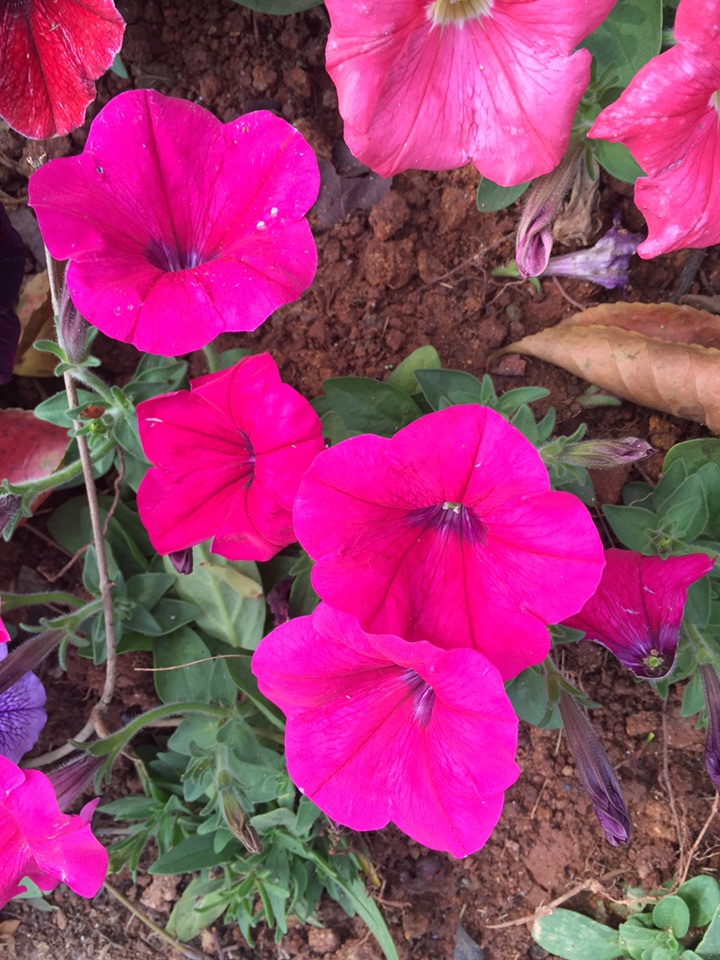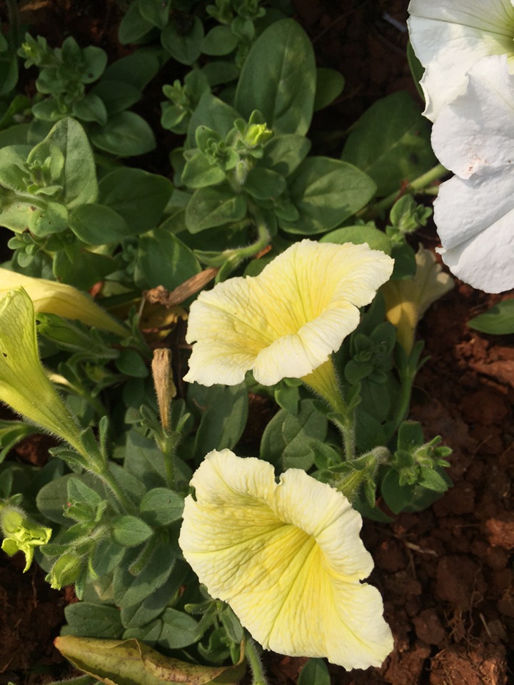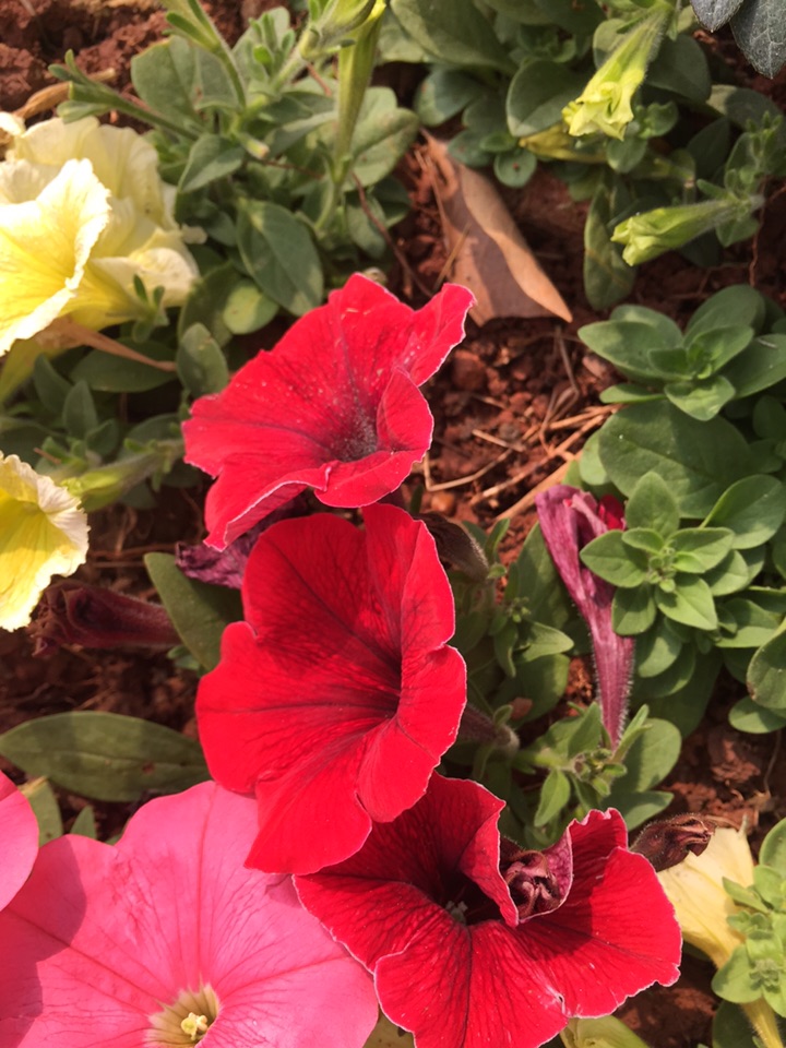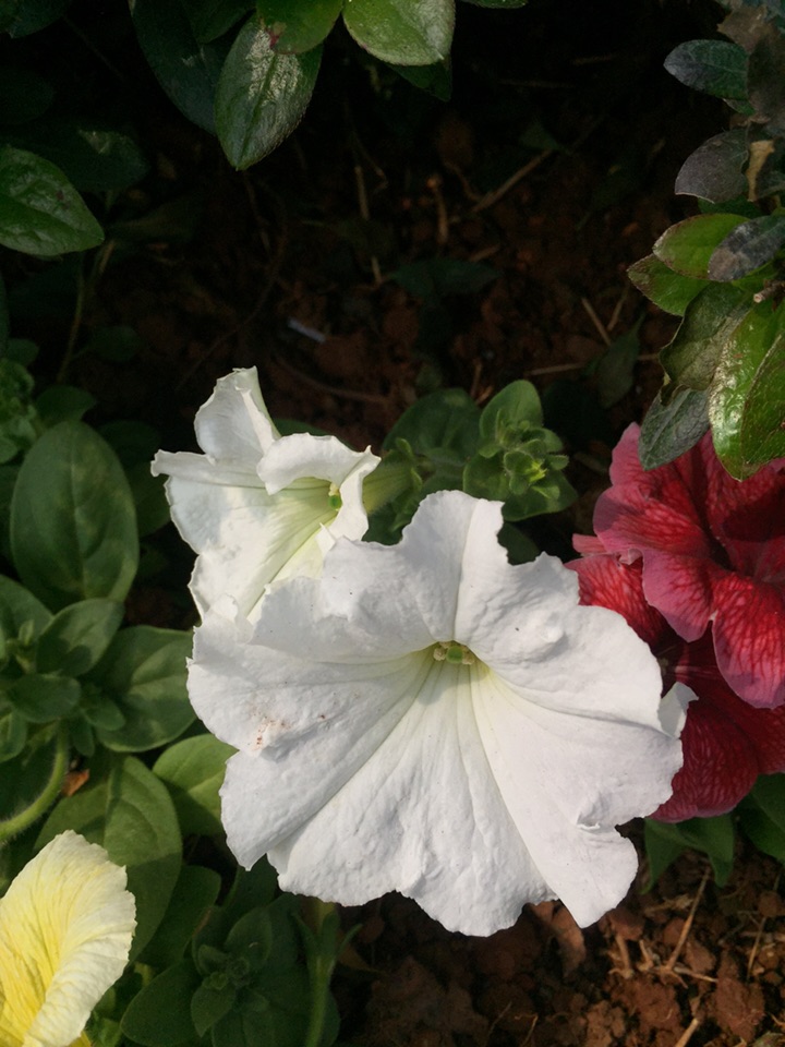广场上的花坛里,春节期间种植了很多的花草。其中碧冬茄的颜色特别丰富,可以说是五颜六色,从深紫、深红到纯白,今人眼花缭乱。(20180217)