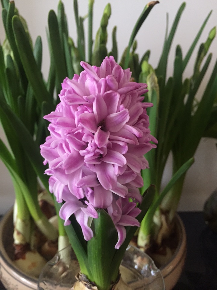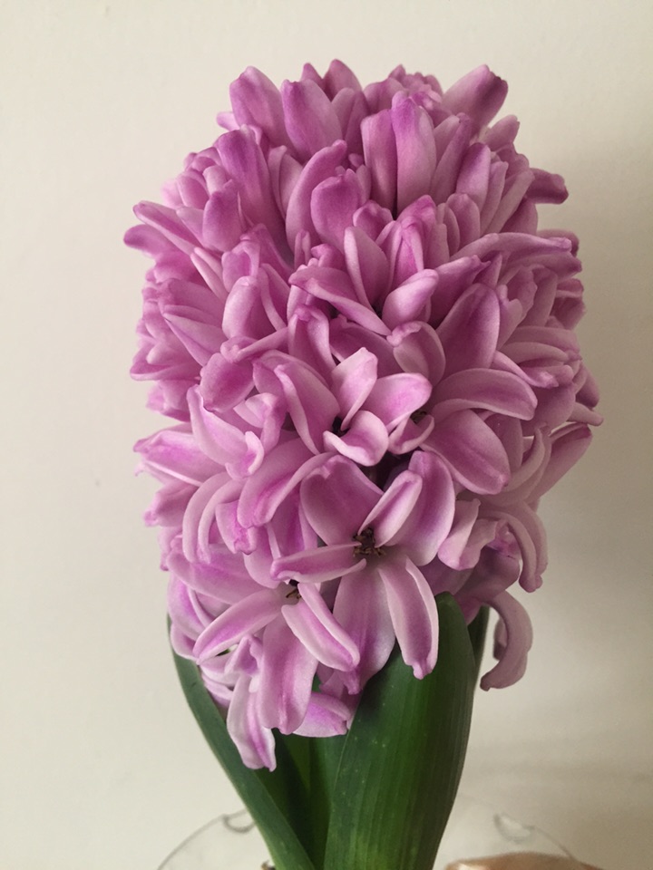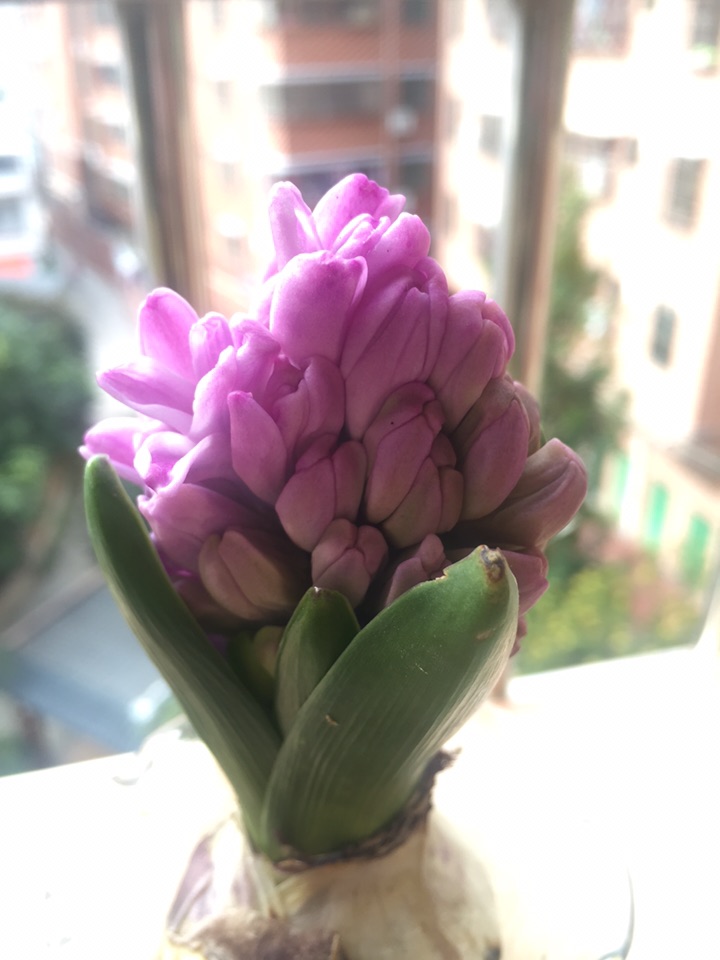 也许是因为近期一直天气暖和,所以风信子也应节而开。我这一株是淡雅的紫色。在这温暖的春节里,它已经从含苞待放到全部盛开,凑前一些,能闻到浓浓的花香,让人沉醉。(2018010217)