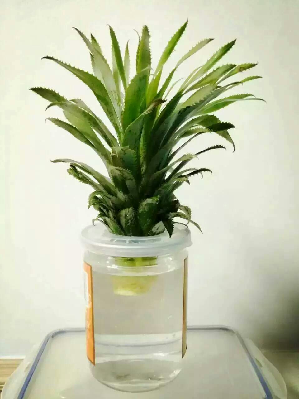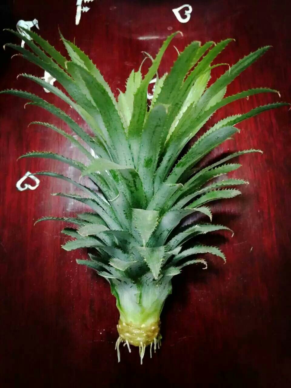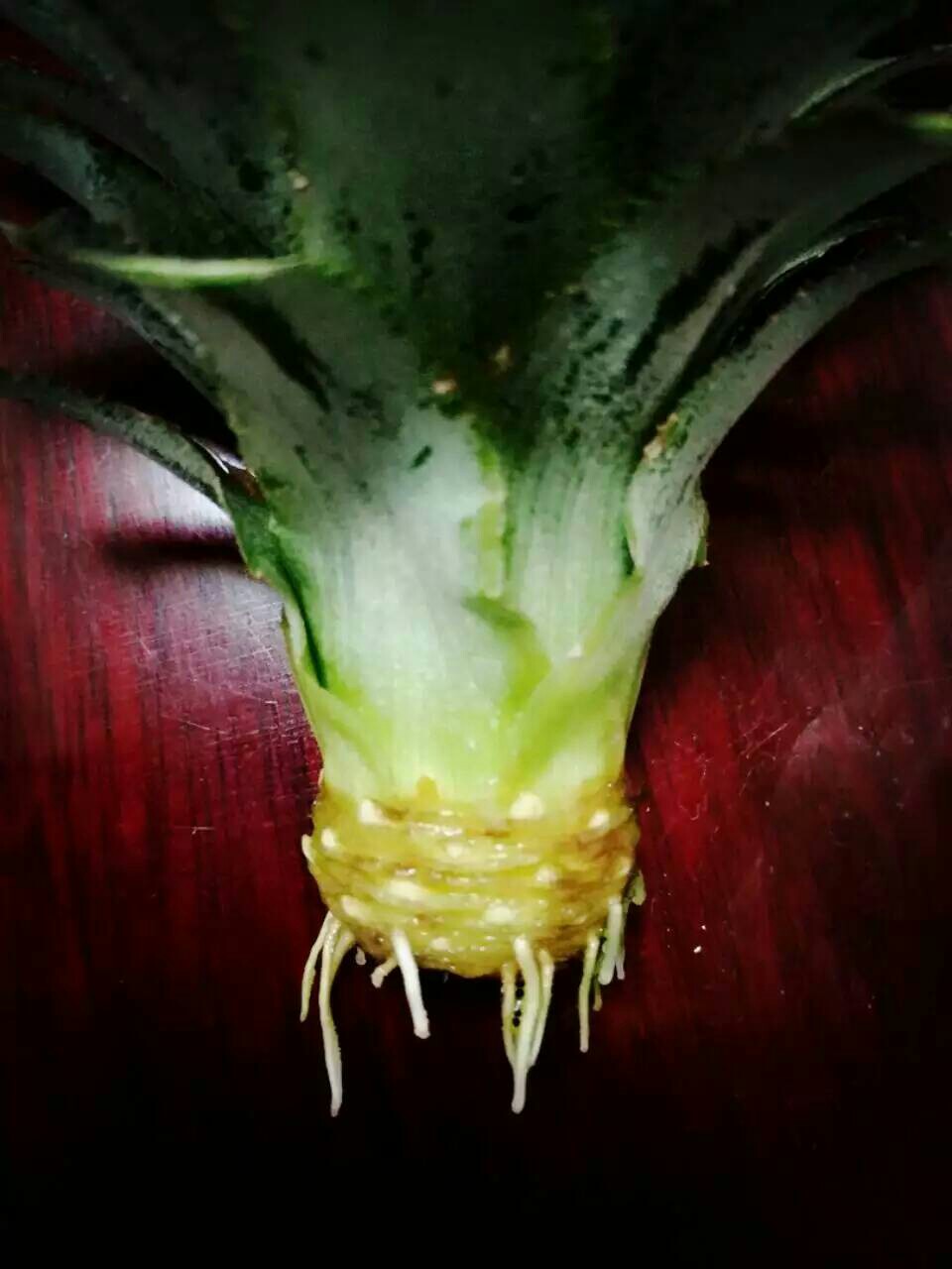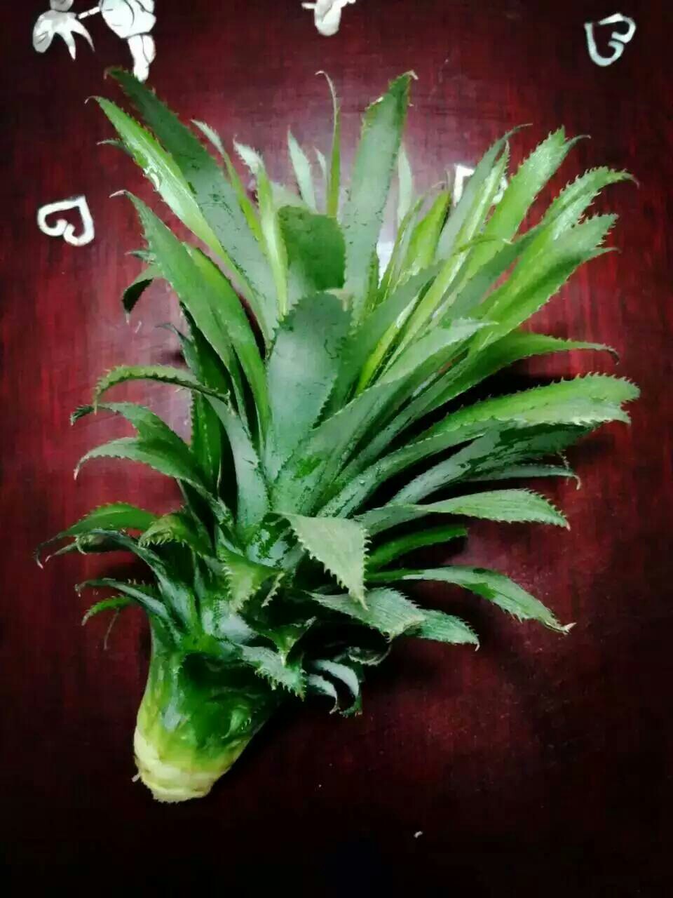 经常在网上看到有人介绍水培菠萝头的文章,决定养个试试看。于是买了个头部比较齐整漂亮的菠萝回家,把菠萝头底部的肉质清理干净,批去老叶子,顺便把叶子也洗了洗,看上去很是青翠。