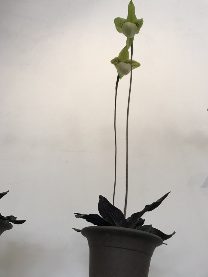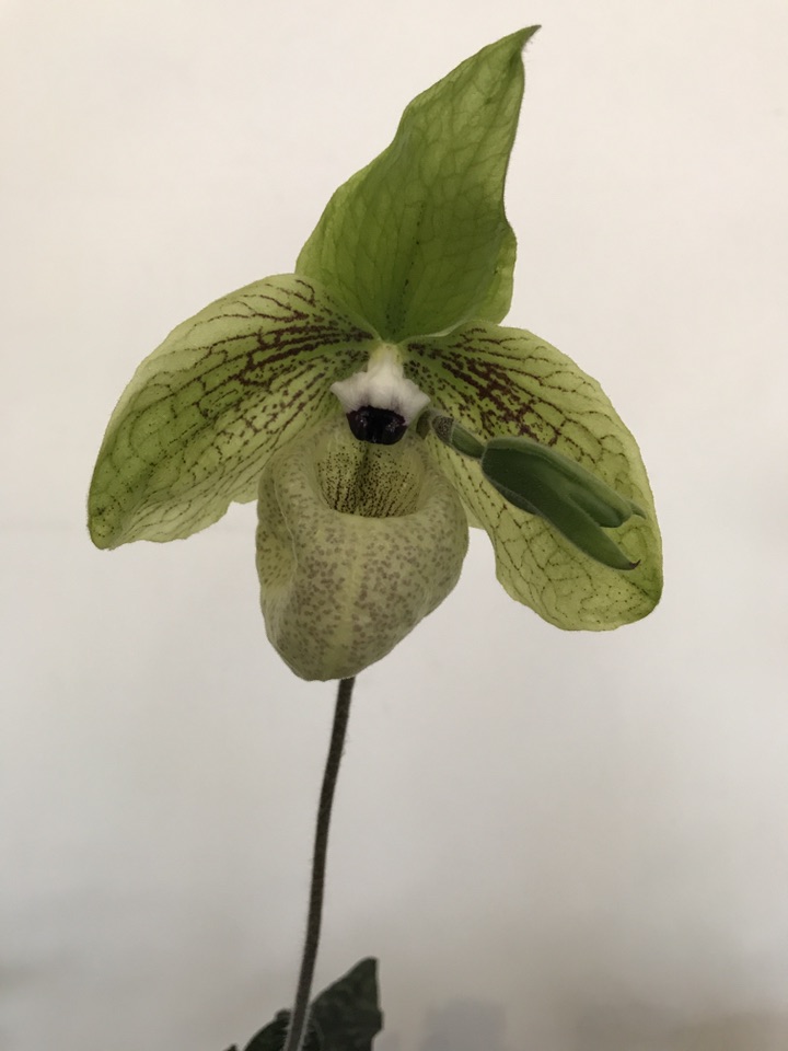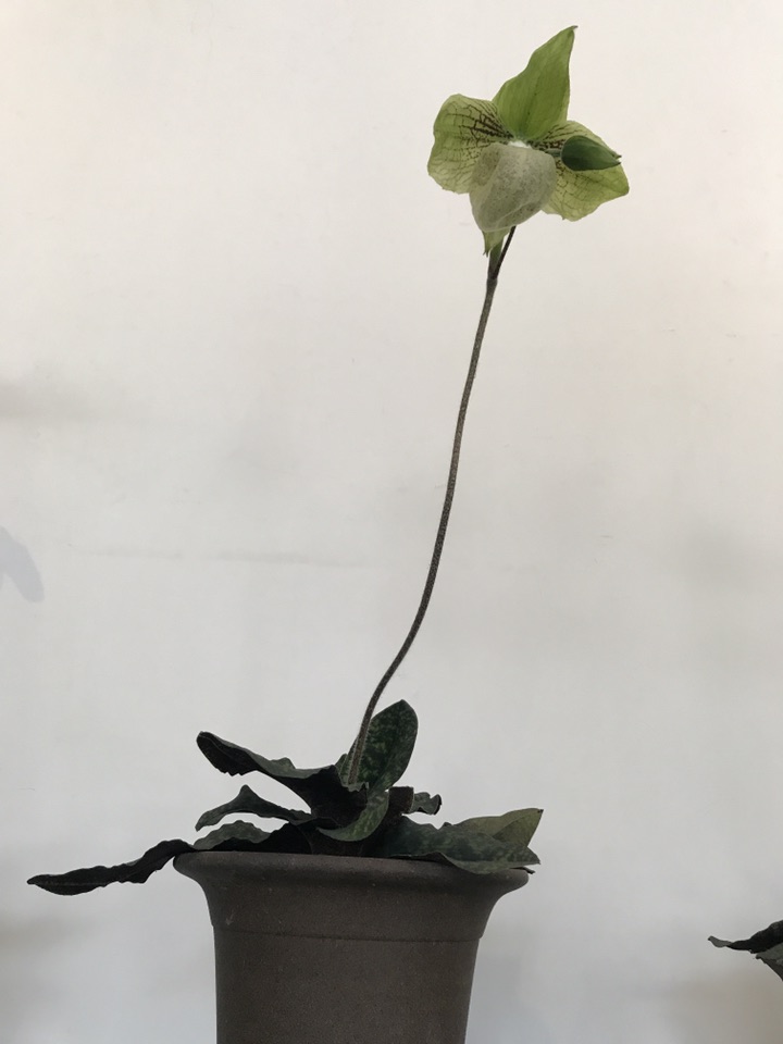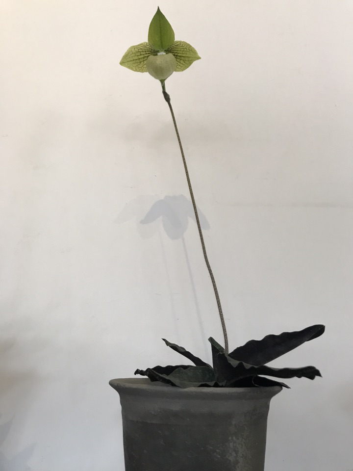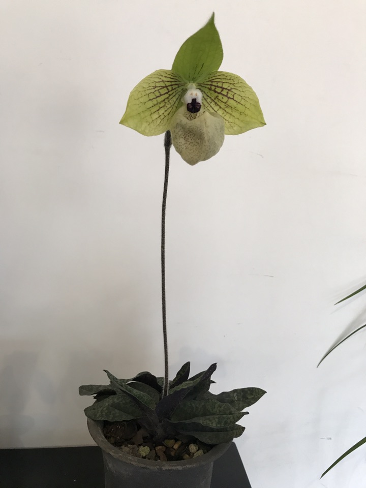 就这么亭亭玉立于桌前,刚开始看到它还以为是假花呢,看到标签后才知道,原来她叫麻栗坡兜兰。主要分布于中国云南东南部(麻栗坡、文山、马关)。越、广西西部(那坡)、贵州西南部(兴义)以及越南北部,生于石灰山林下和灌丛下腐殖质丰富的泥土中。遗憾的是尽管分布范围较广,但由于过度采集和其自身生物学原因,目前在野外已难觅其踪。