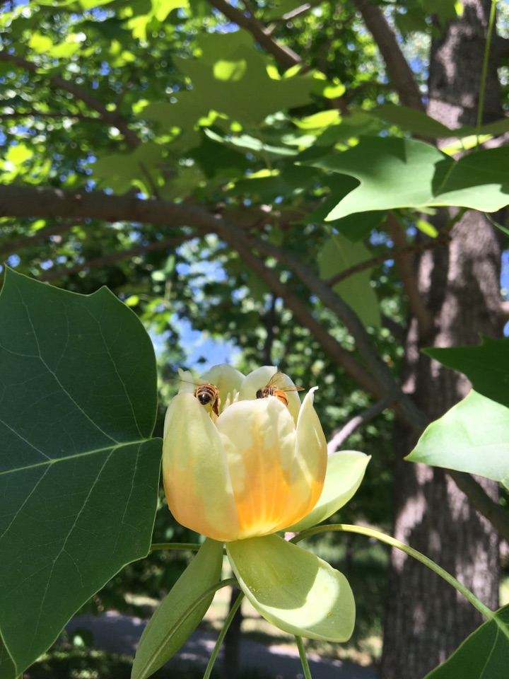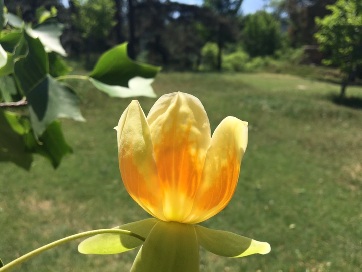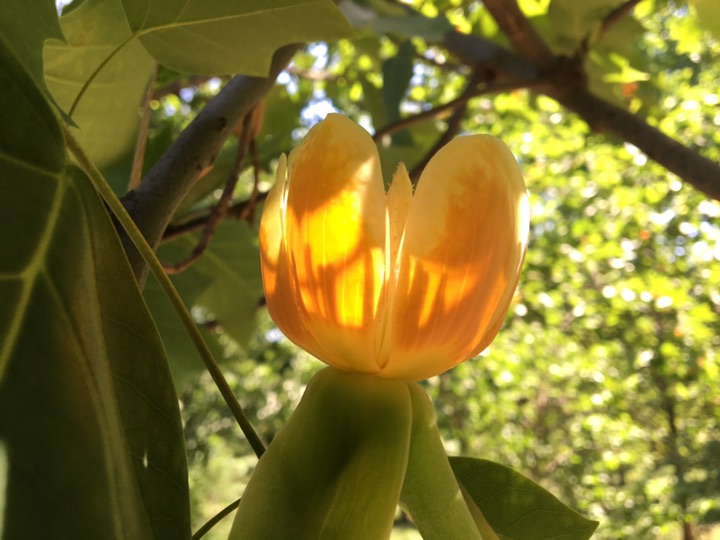 去年五一节前,看到了北京植物园公众号四月二十六日推送的文章,知道了有一种郁金香是长在树上,其花色黄,从侧面看,像极了黄中带着红色竖条的郁金香,实际上,树的英文名字就叫Tulip tree。