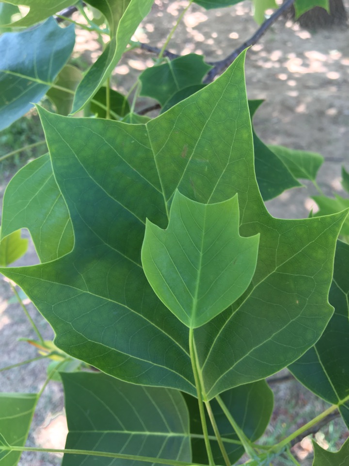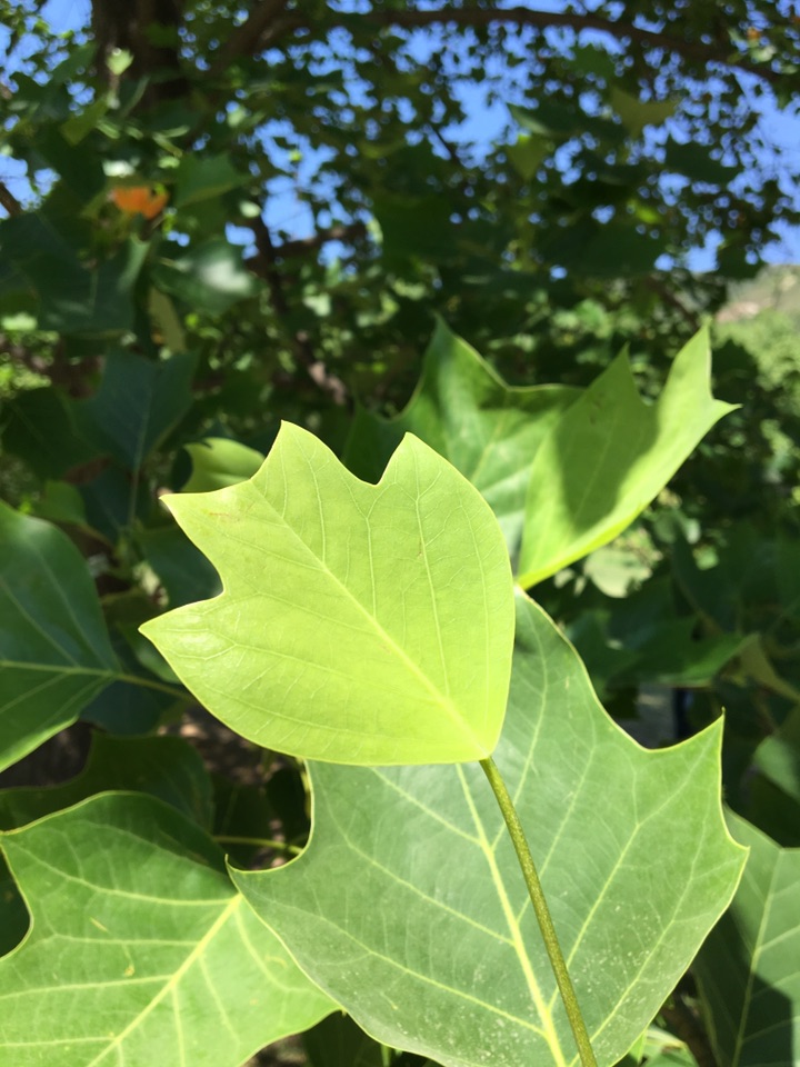 树上的郁金香除了花惹人爱怜,其叶子也十分有趣。树上的大部分叶子像以前穿的马褂,因此该树又被称为马褂木。我观察发现,其树叶不仅像马褂,有的也像我们画中的房子,有的还像小蘑菇,更有的像古代的刀币,另外,我还猜测到了该树学名为鹅掌楸的原因,有的叶子也确实长得像鹅掌。