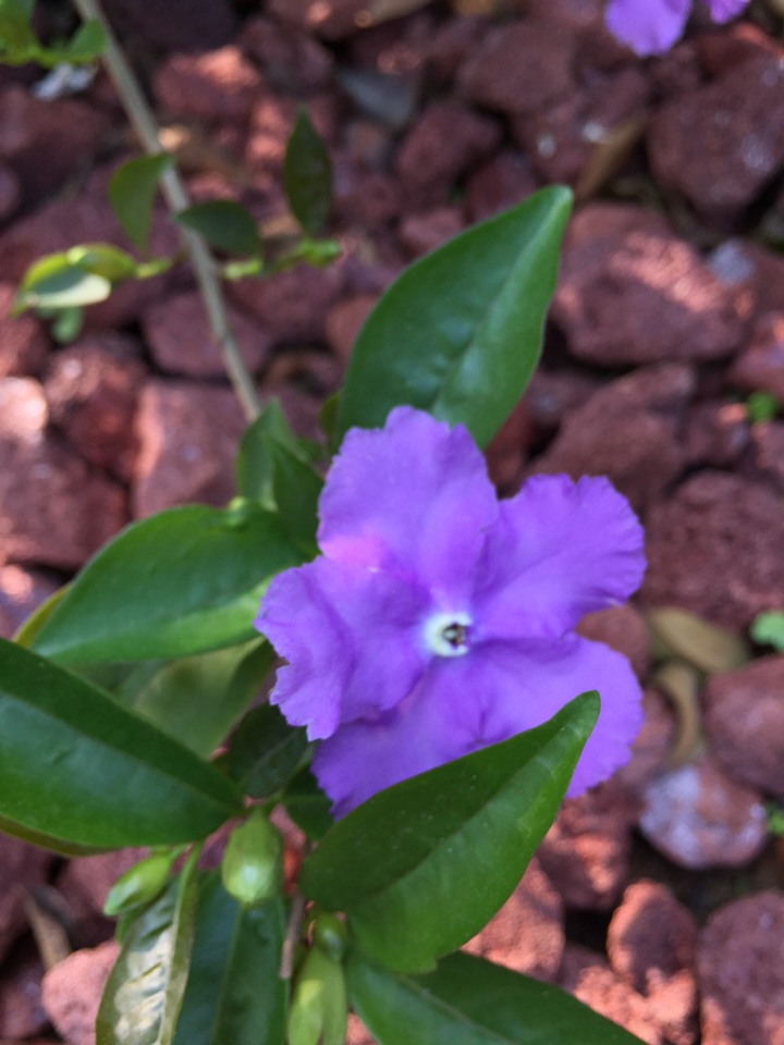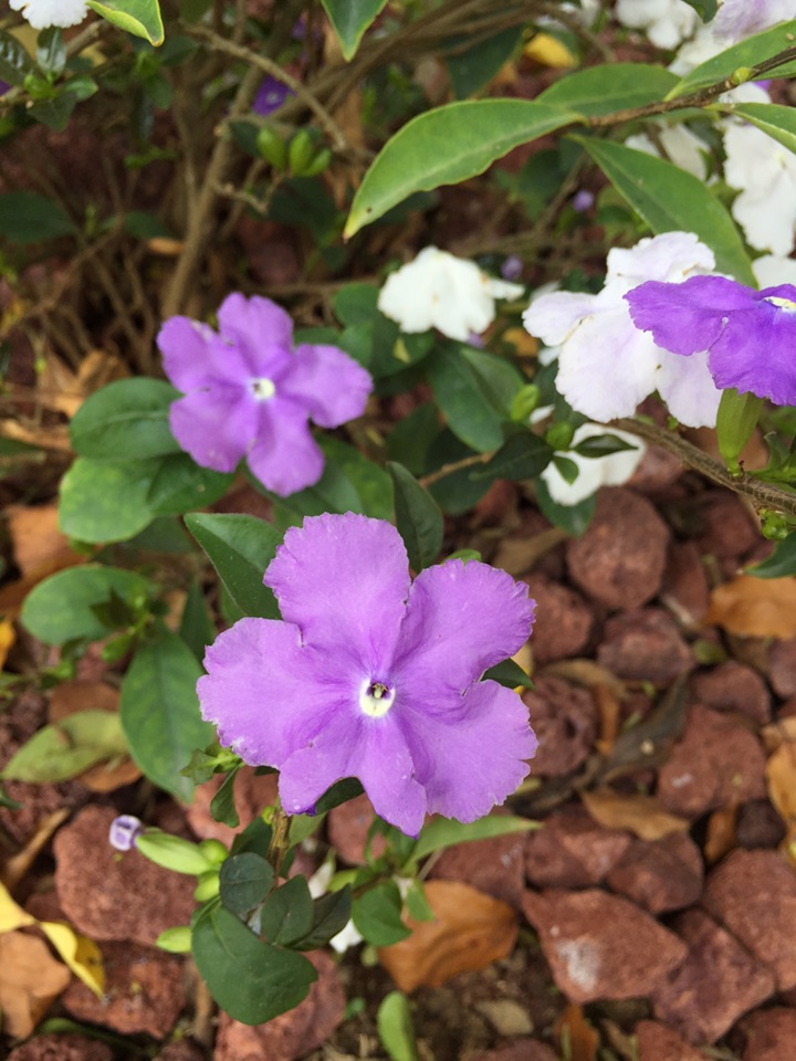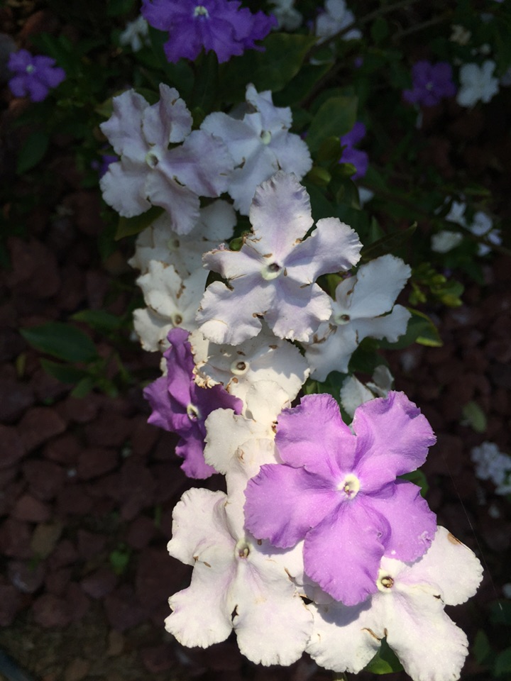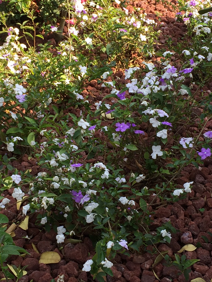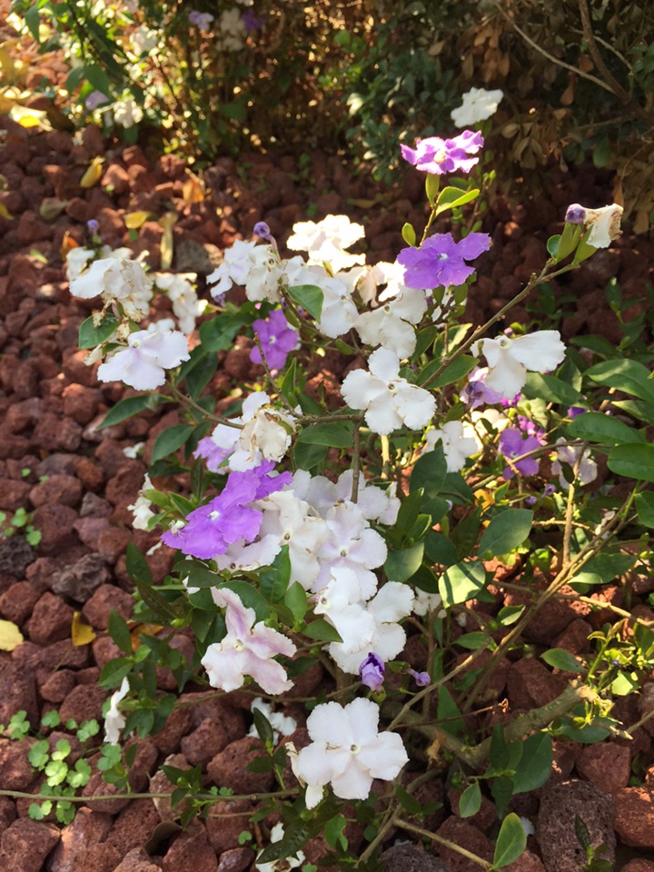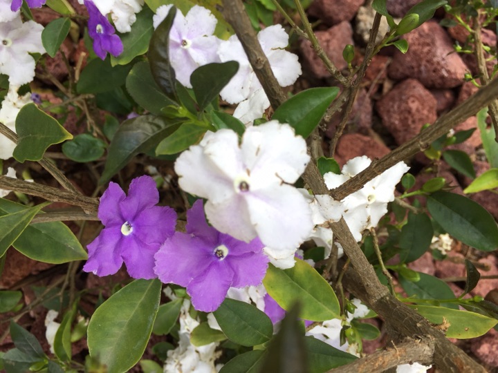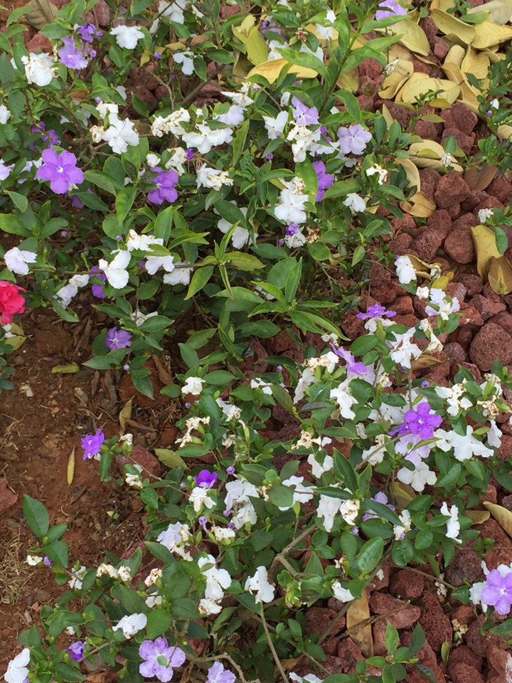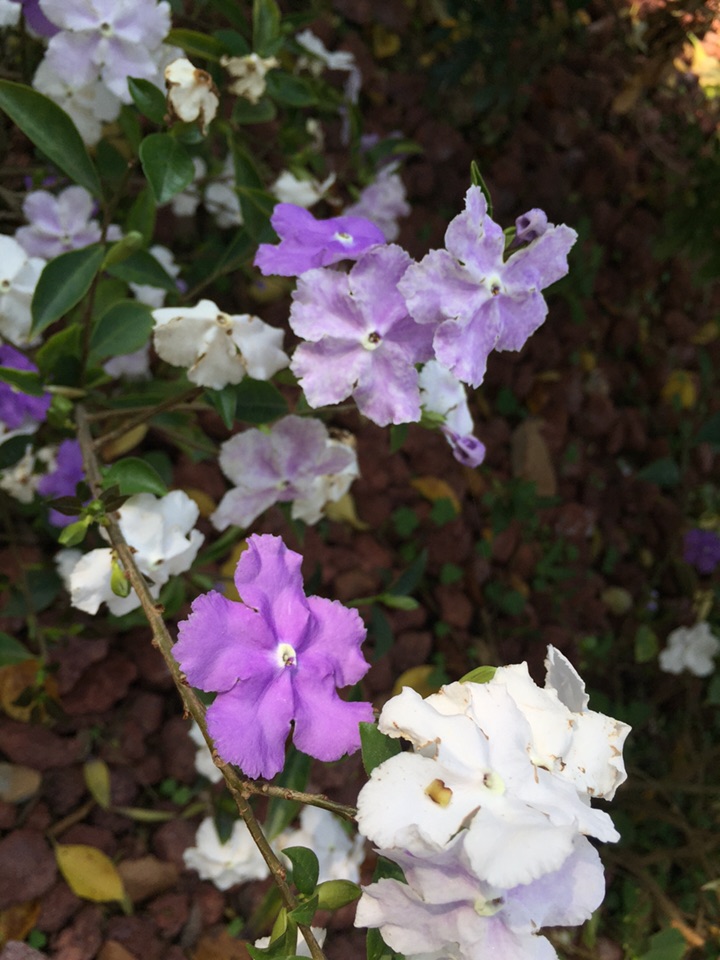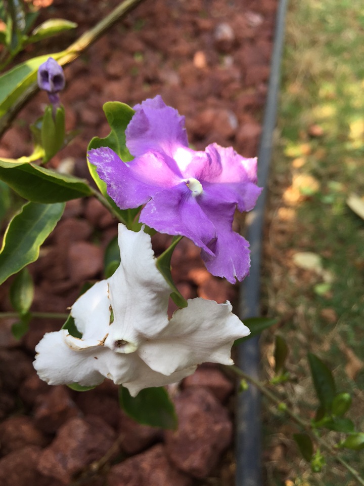 喜欢它的名字:鸳鸯茉莉。这种花儿的香气馥郁,而花的颜色也很特别,一花两色,紫的优雅,白的纯洁。