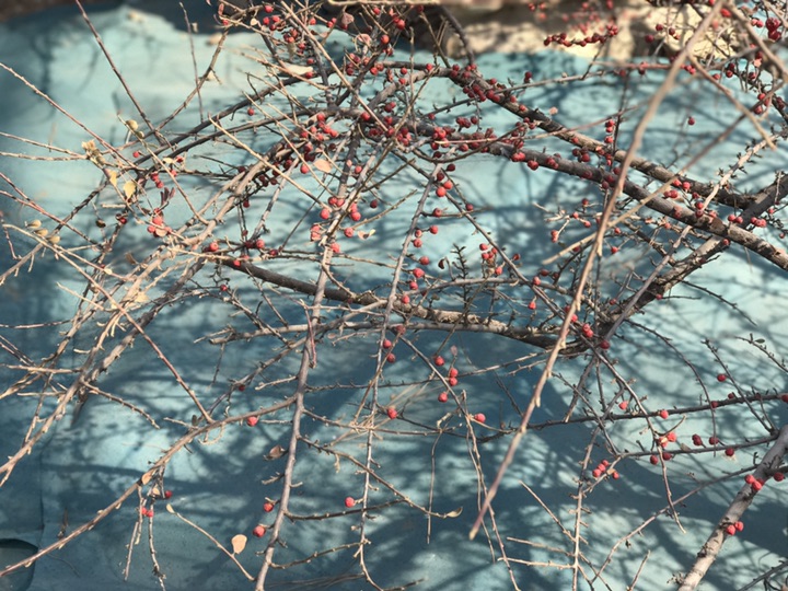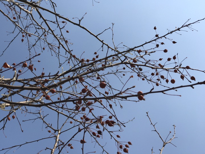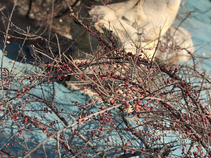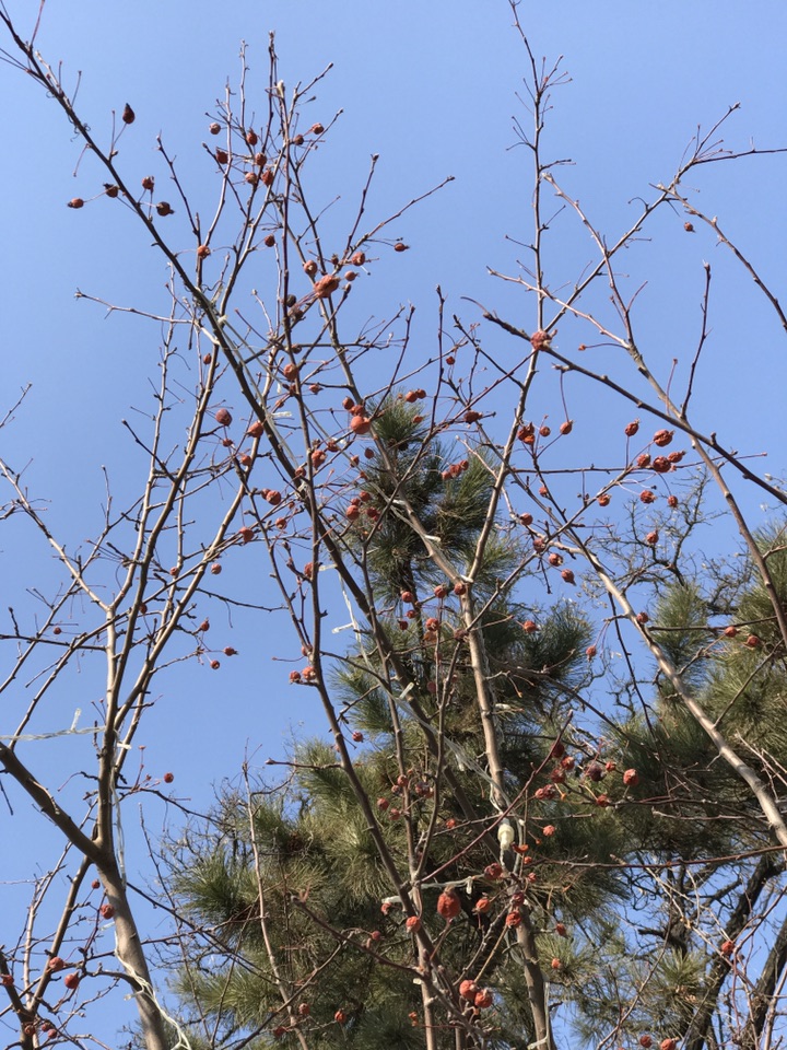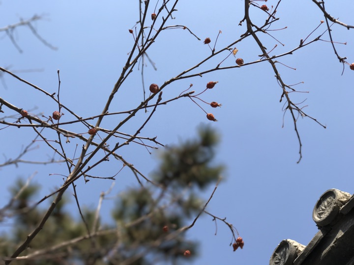 假山的另一边立着几株海棠,上面还依稀留着不少果子。同样是干瘪暗淡的红。在此就不赘述了,等海棠花开的时候再细说吧