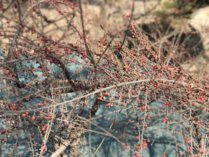 感觉也没啥了,带着点遗憾准备出园。就在南门口,意外的发现假山旁有两丛灌木,上面布满红红的小果子。凑近一看,原来是它——平枝荀子。居然满枝的小红果,虽说有点干瘪但在这缺少色彩的季节还是觉得挺好看的。对于平枝荀子想必还是有很多人不熟,在此简单的介绍一下吧。平枝荀子为半常绿匍匐灌木,主要观赏价值是深秋的红叶。在深秋时节,平枝栒子的叶子变红,分外绚丽。因平枝栒子较低矮,远远看去,好似一团火球,很是鲜艳。在每年的深秋,在植物园里经常有摄影家被它鲜艳的红叶吸引住,成为意外发现,对它拍照。平枝栒子的花和果实也有观赏价值。其花因开放在初夏,它的粉红花朵在群绿中却默默开放。粉花和绿叶相衬,分外绚丽。平枝栒子的果实为小红球状,终冬不落,雪天观赏,别有情趣。其实平枝栒子是一种很好的园林植物,特别是在园林中,和假山叠石相伴,在草坪旁、溪水畔点缀,相互映衬,景观绮丽。