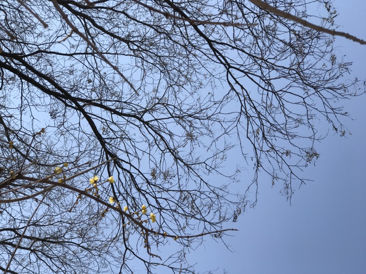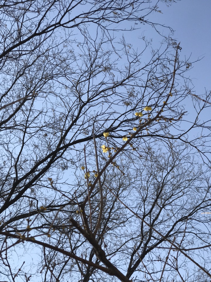 到了宣武艺园才发现,除了散散步并没啥看头。里面的亭台楼阁都在整修,操作机器轰鸣刺耳,池塘里的水也所剩不多浑浊不堪,还散发着阵阵恶臭。逛了一圈然后就直奔心心念念的那几株腊梅而去。可惜这里的腊梅并不给力,只是些许初绽花蕾,估计还得等上个十天半个月才能繁花满枝头。树的顶端还开了几朵 好容易才拍到一枝黄花向天吼