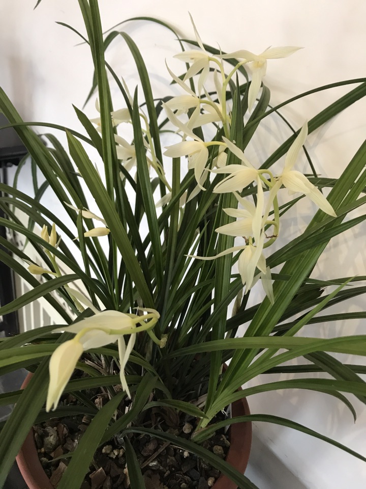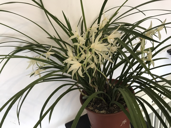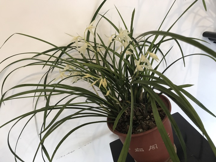 大雪素,因叶宽、花白如雪而得雪素一名。别名大素心、宽叶素心,亦叫元旦,属地生兰类,是独立的品种,有千余年的家养历史。均系园艺栽培变种,已有数百年的栽培历史,原产于云南的部分地区,春节前后开花,花径约8cm,瓣长4cm左右,花瓣与荷型瓣近似,主瓣窄荷型,副瓣平肩或落肩,唇瓣阔圆,雪白反卷,唇盘的中部有淡淡的红晕(这是识别大雪素的关键特征)。整花洁白如雪,一葶花开2至5朵,花型大,花盖叶,群花盛开时,好似白鹳翱翔于森林。花杆为绿玉色或白玉色。