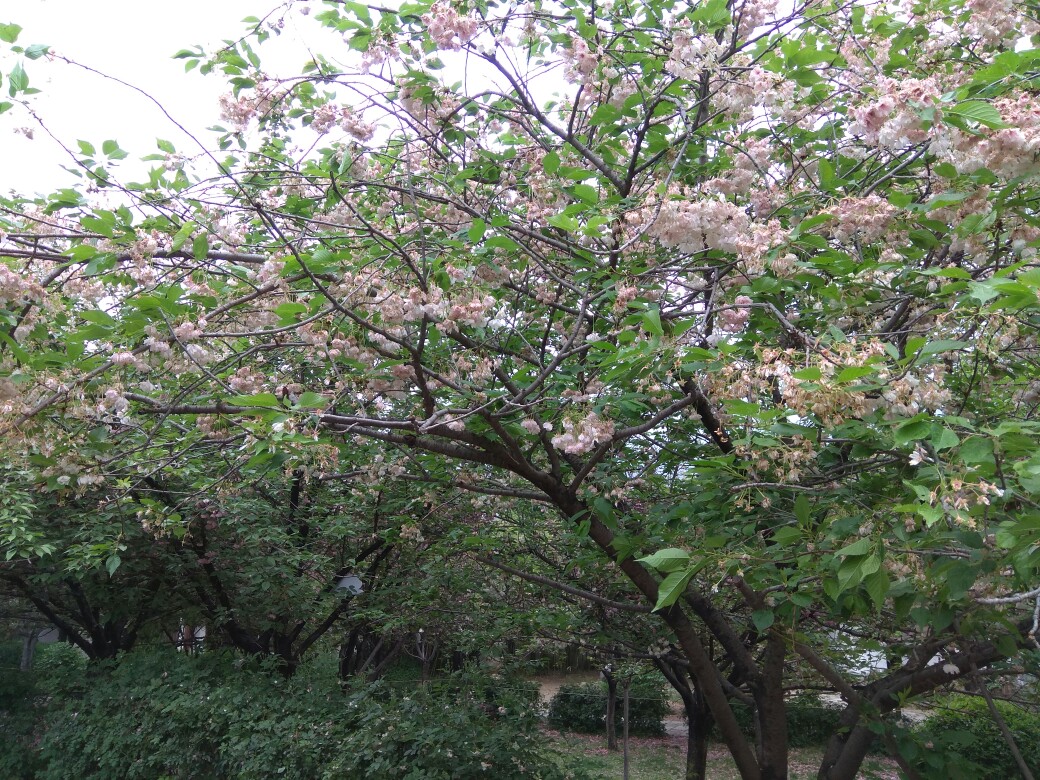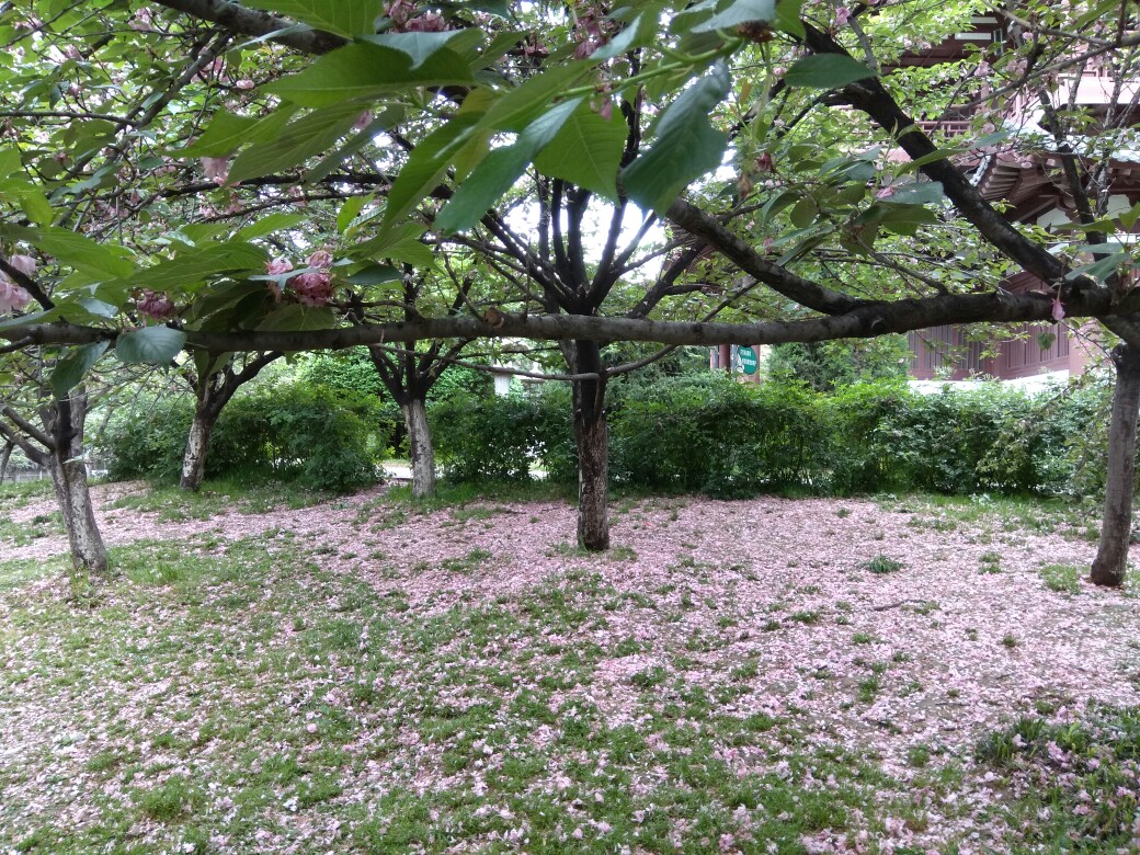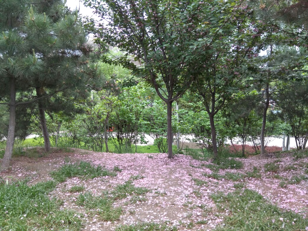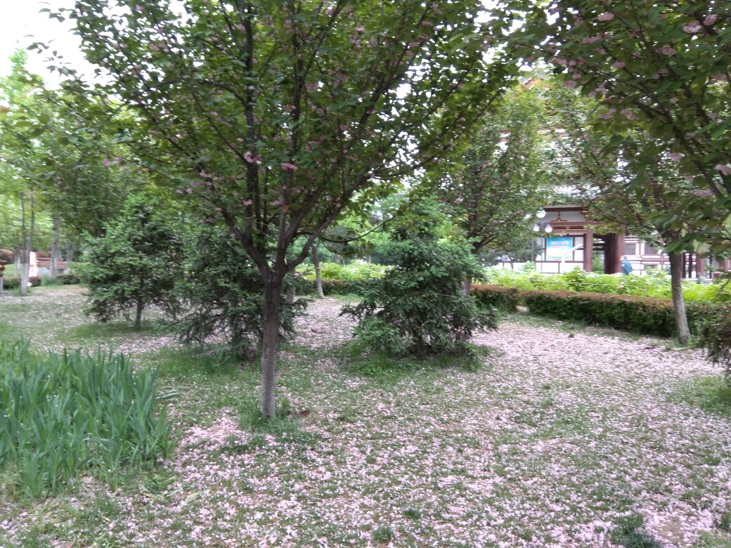 青龙寺的樱花树,花已开败,满地花瓣。