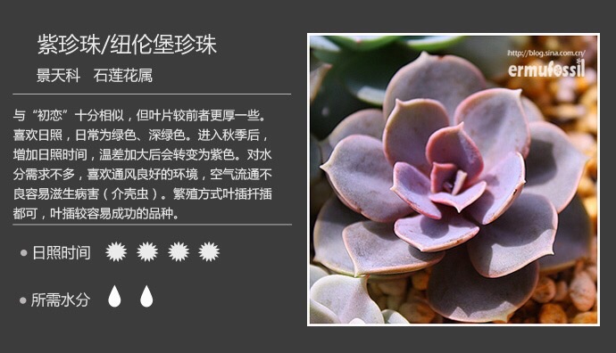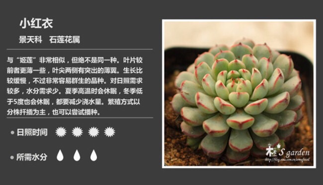 可结合图鉴的提示对该品种多肉植物进行养护,一个太阳代表每天日照一小时,2个代表每天日照两小时。一个水滴代表一个月浇水一次,2个代表一个月浇水两次,浇水时间并不严格,因季节与气候不同,地域不同,有所不同。以上仅供参考。