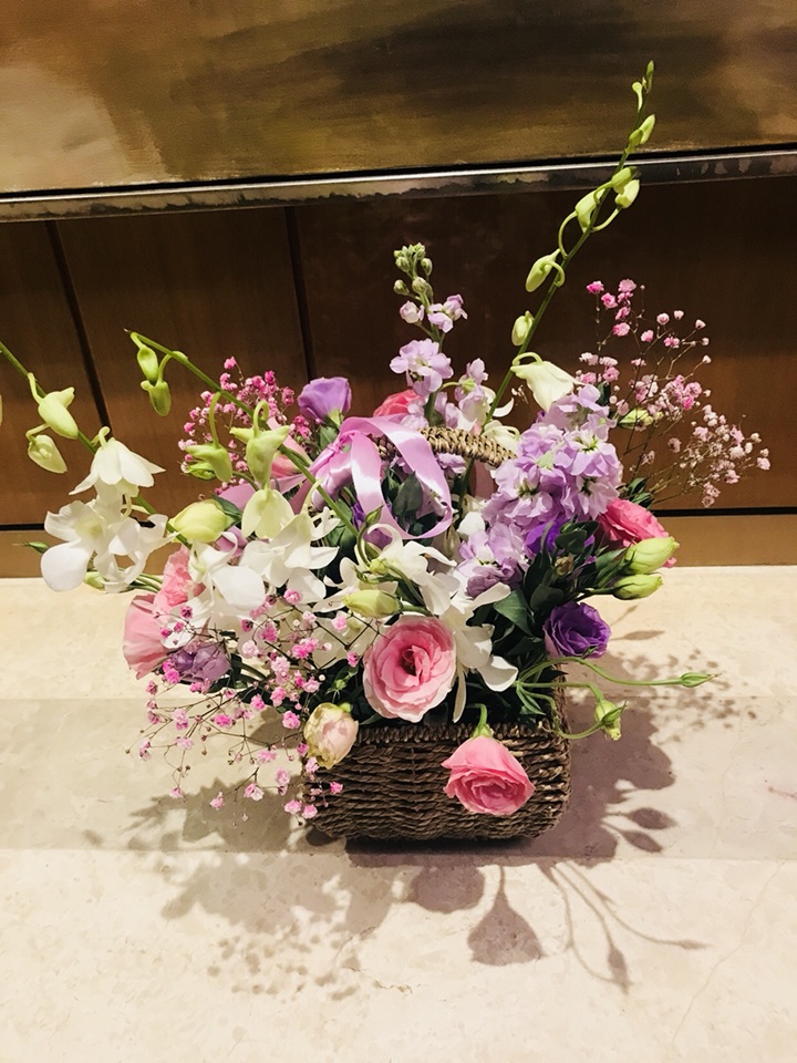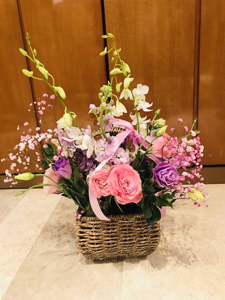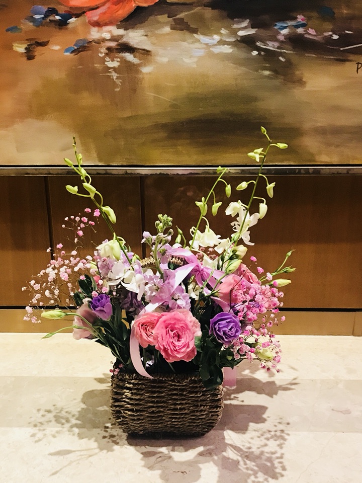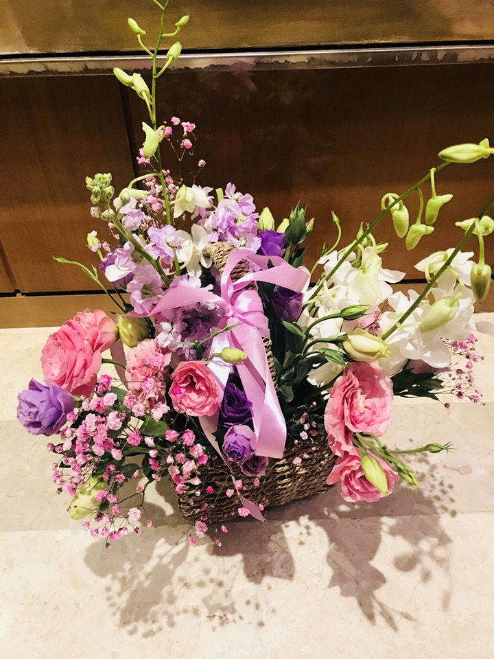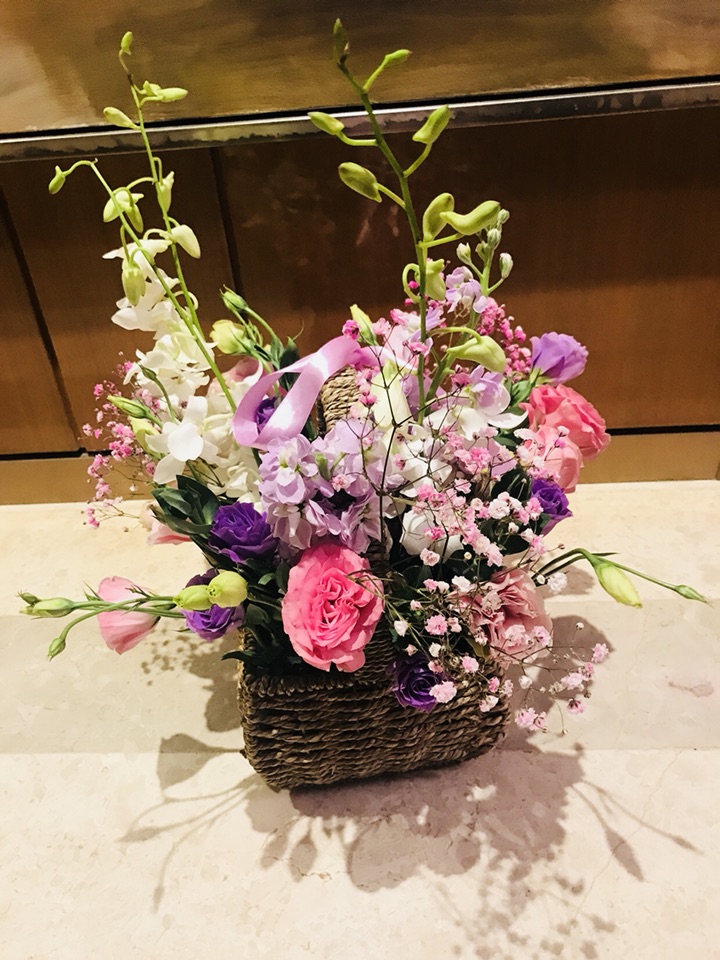 那么,下面赤星就罗列一下,此款插花需要哪些花呢? 1.月季(图中粉色花朵)。 2.桔梗(图中深紫色花朵)。 3.白色石斛(图中白花)。 4.紫罗兰(图中淡紫色花朵)。 5.小小坠石花(图中粉红色星状小花)。 以上就是材料花了,插花顺序可以改变,但是刚买的花一定要剪,花篮大小及样式都可以根据个人喜好选择。