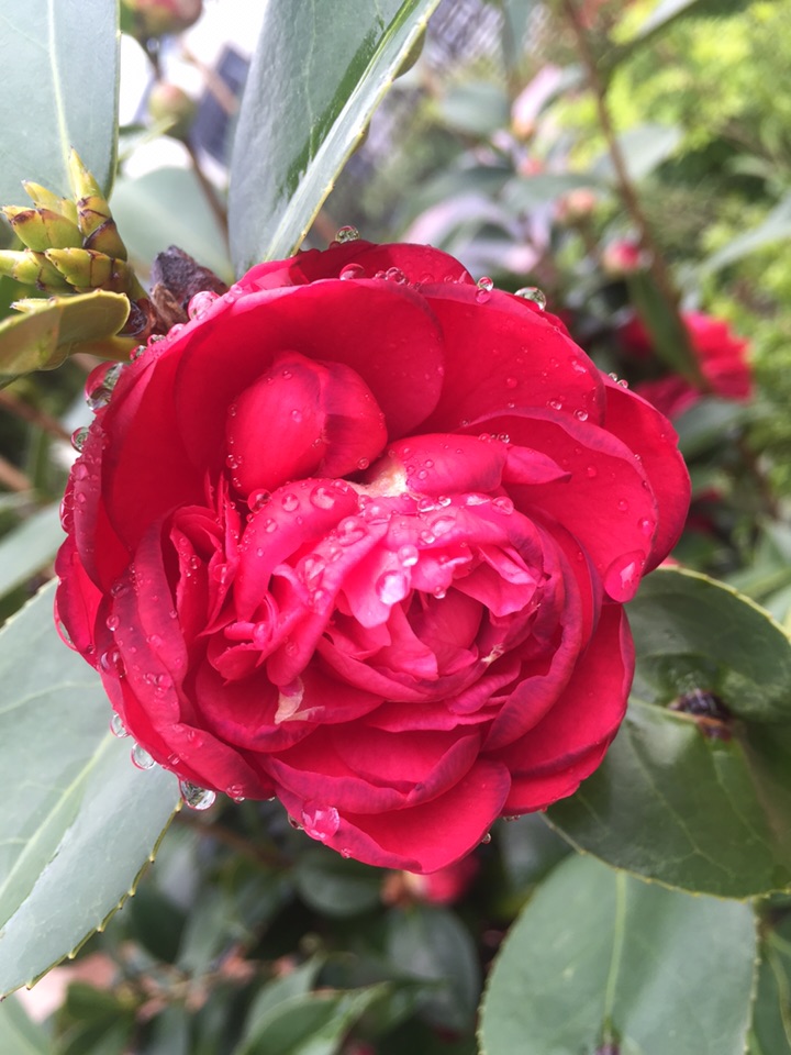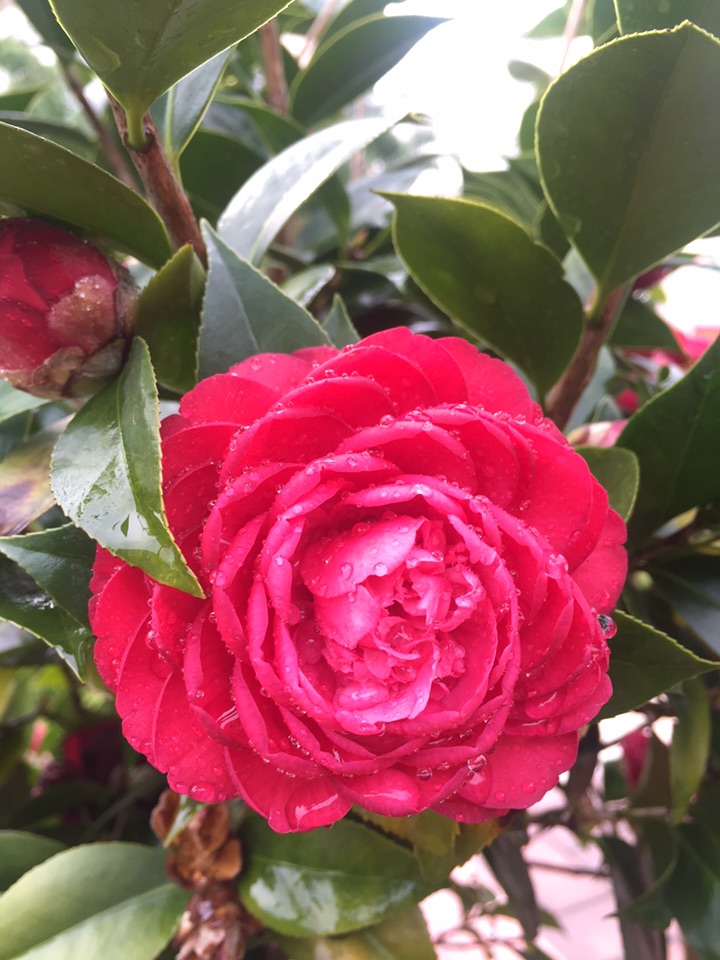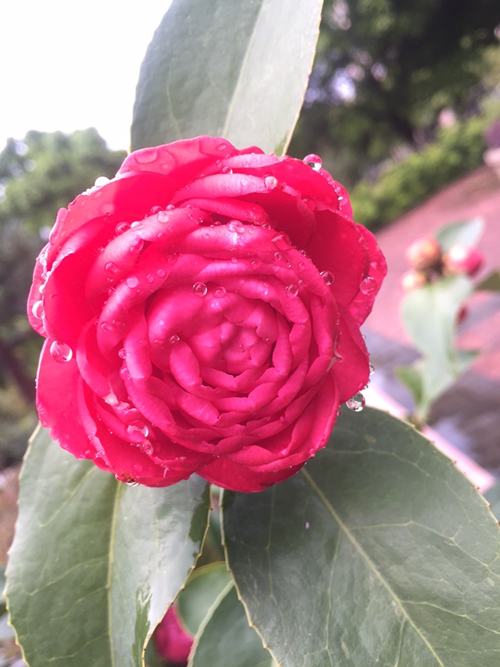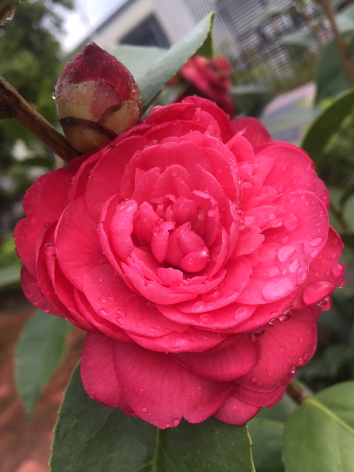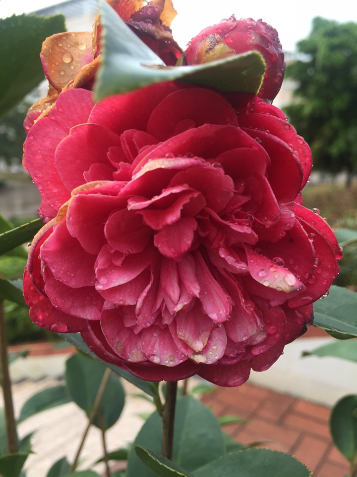 好吧,出门去。经过花坛边,开了一个多月的山茶仍在艳艳地开着。大雨过后,花儿也吸饱了雨水,显得厚重了一些,而花瓣上沾满了水珠儿,倒是另有一番风情。