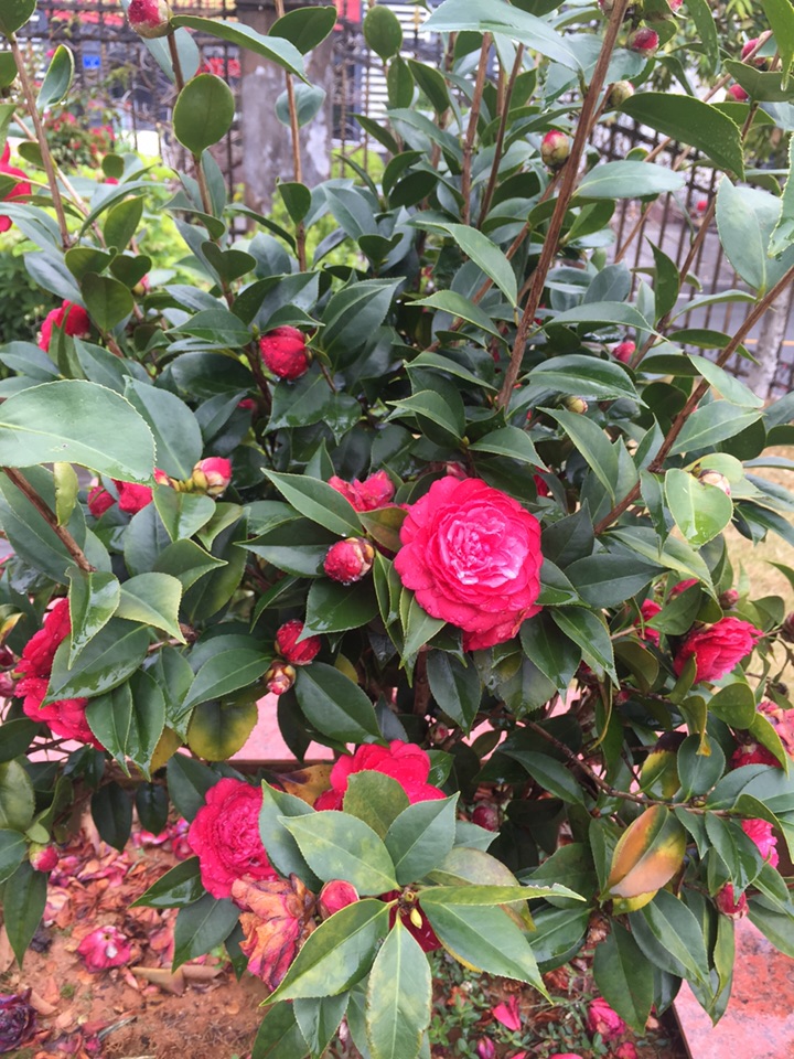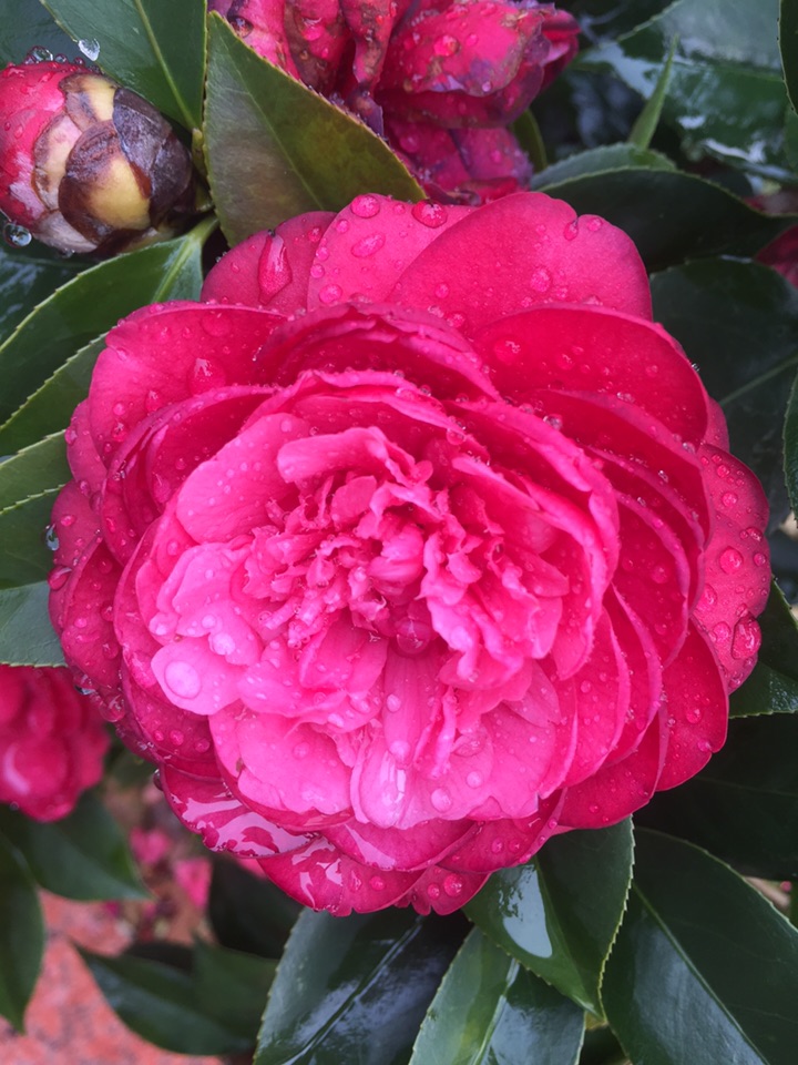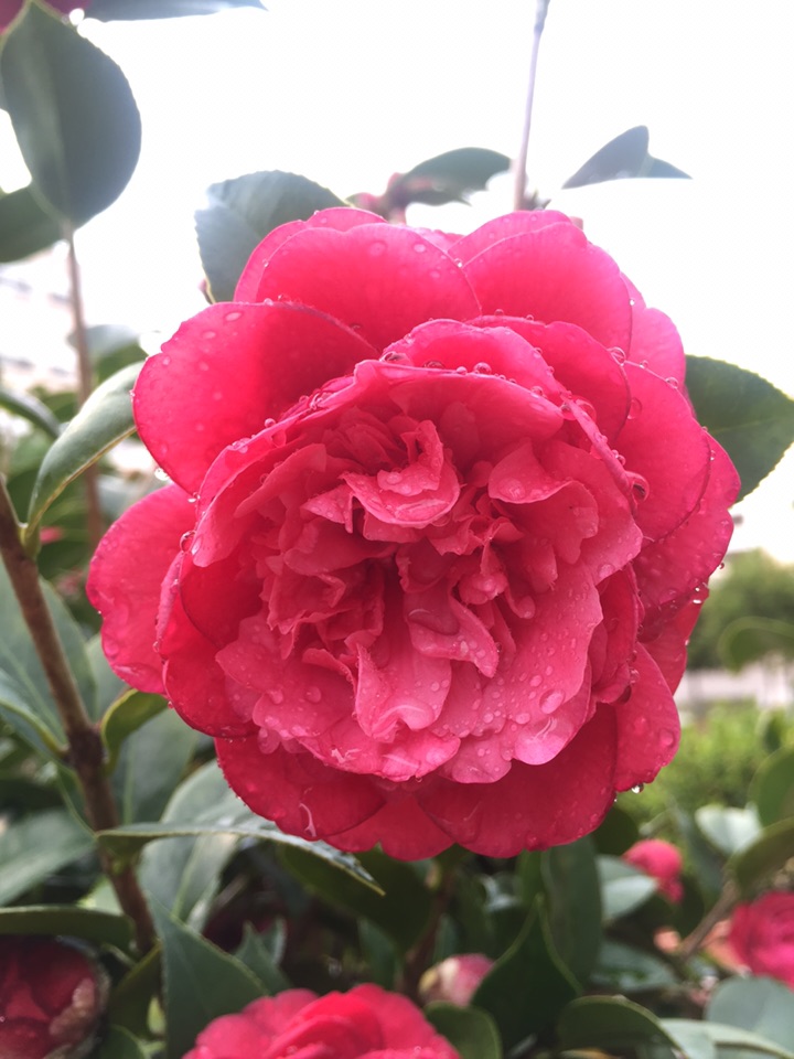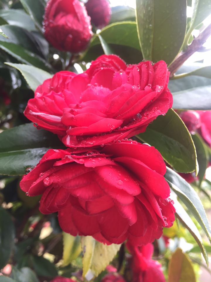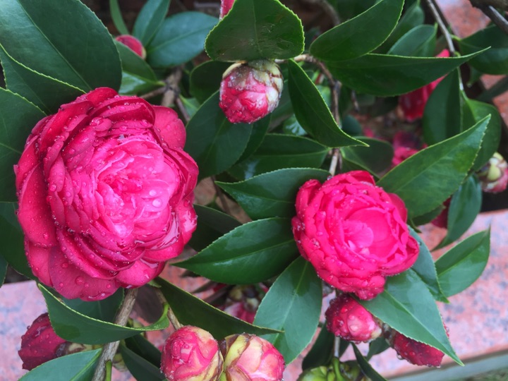 好吧,出门去。经过花坛边,开了一个多月的山茶仍在艳艳地开着。大雨过后,花儿也吸饱了雨水,显得厚重了一些,而花瓣上沾满了水珠儿,倒是另有一番风情。