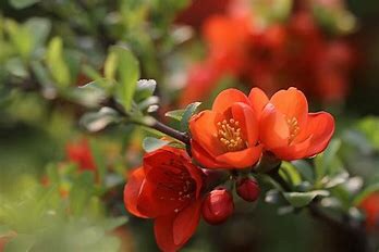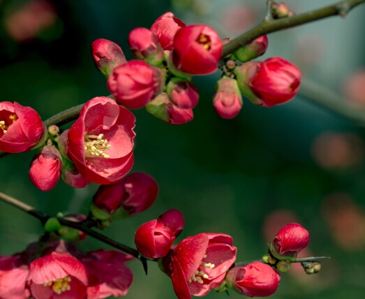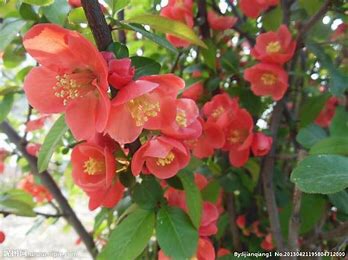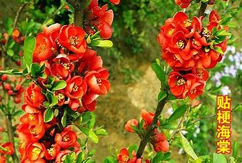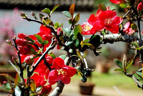 姿色古香古色的贴梗海棠,花期正值农历春节期间。尤其是开红花的品种,那红红艳艳的花朵中间镶嵌着金黄色的花蕊,营造出一份热热闹闹、喜气洋洋的节日气氛。贴梗海棠株高约2米,枝干开展,有刺。叶片长卵形至椭圆形,长3~8厘米,先端尖,基部楔形,边缘有尖锐锯齿。花3至5朵簇生于2年生的老枝上,先叶后花或花叶同放,花色有朱红、粉红或白色,直径3~5厘米。萼片钟状,直立,无毛;花柱基部无毛或稍有毛;花梗粗短或近于无梗。