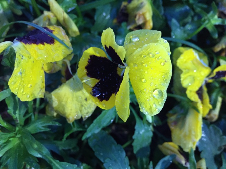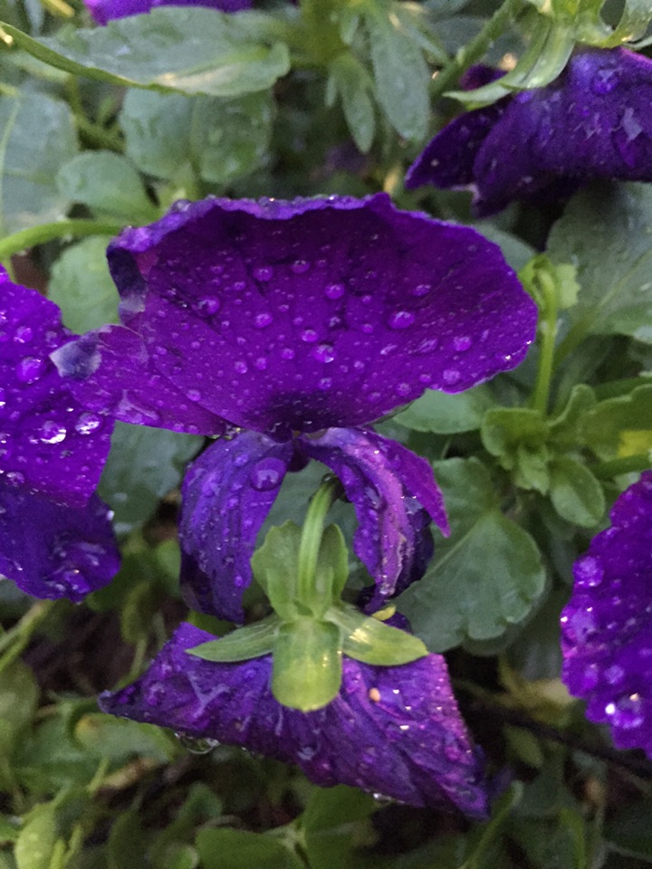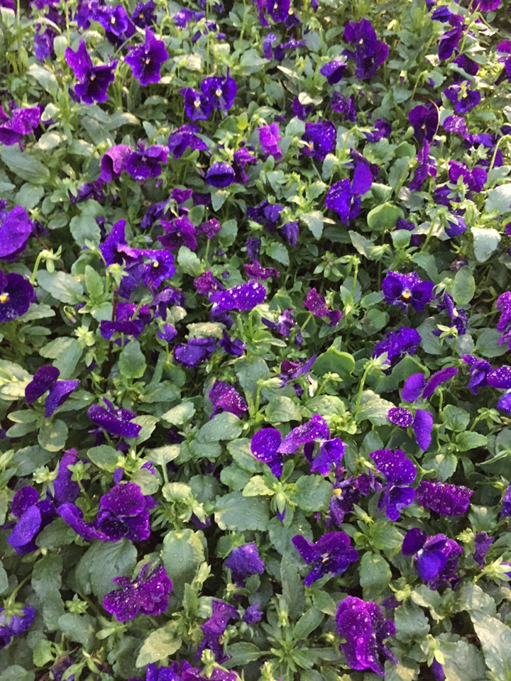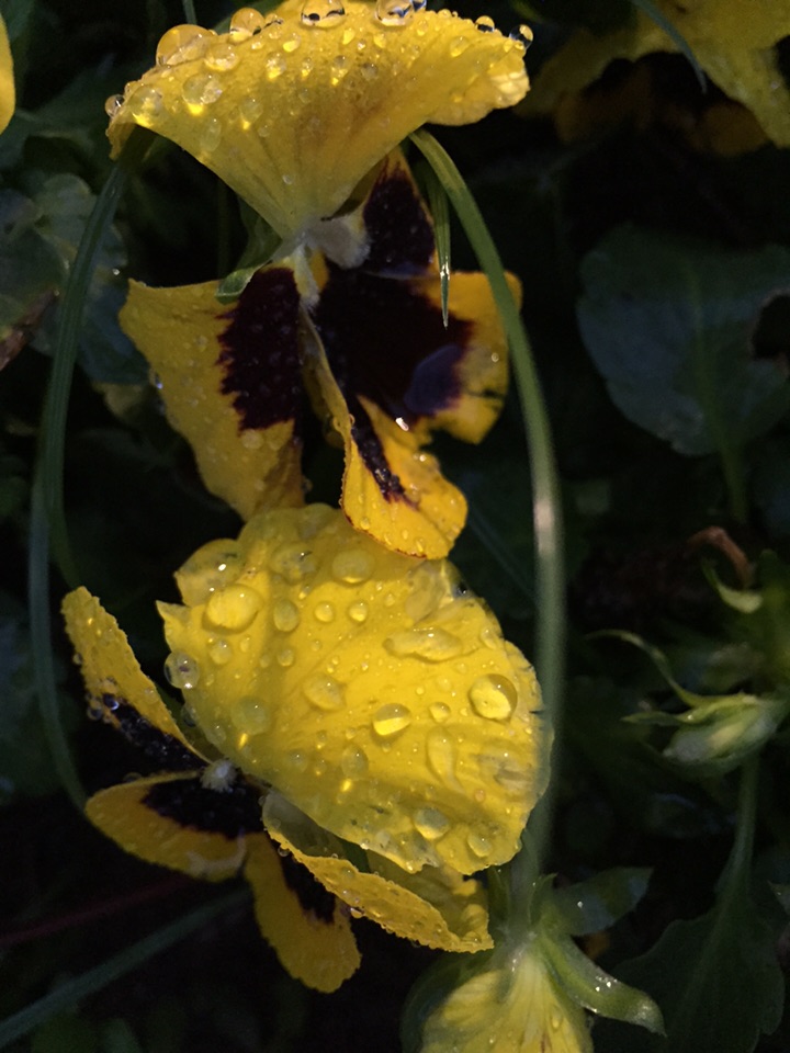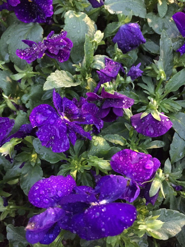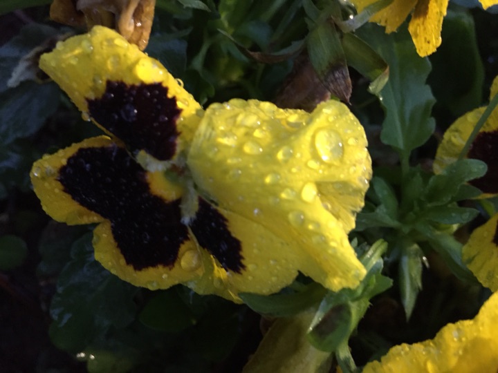 雨后,黄昏,天色渐暗,华灯初上。三色堇的花瓣上沾满了水珠儿。
