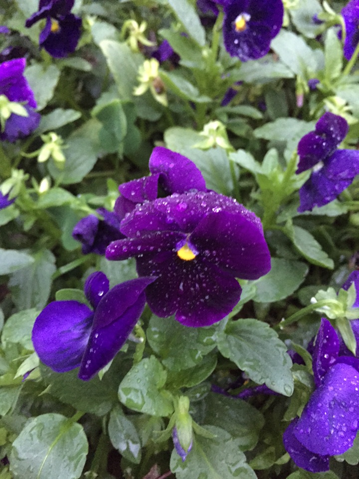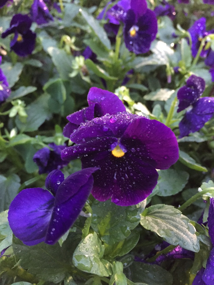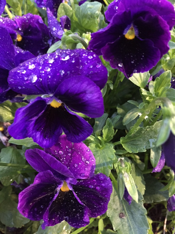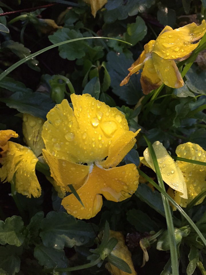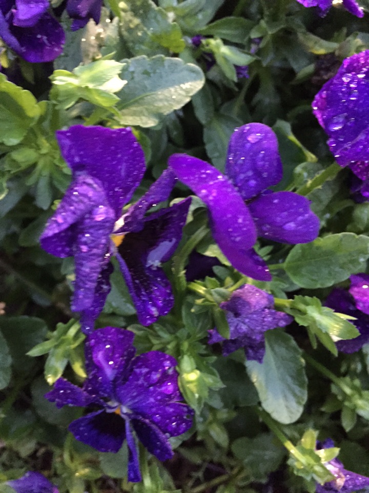 雨后,黄昏,天色渐暗,华灯初上。三色堇的花瓣上沾满了水珠儿。