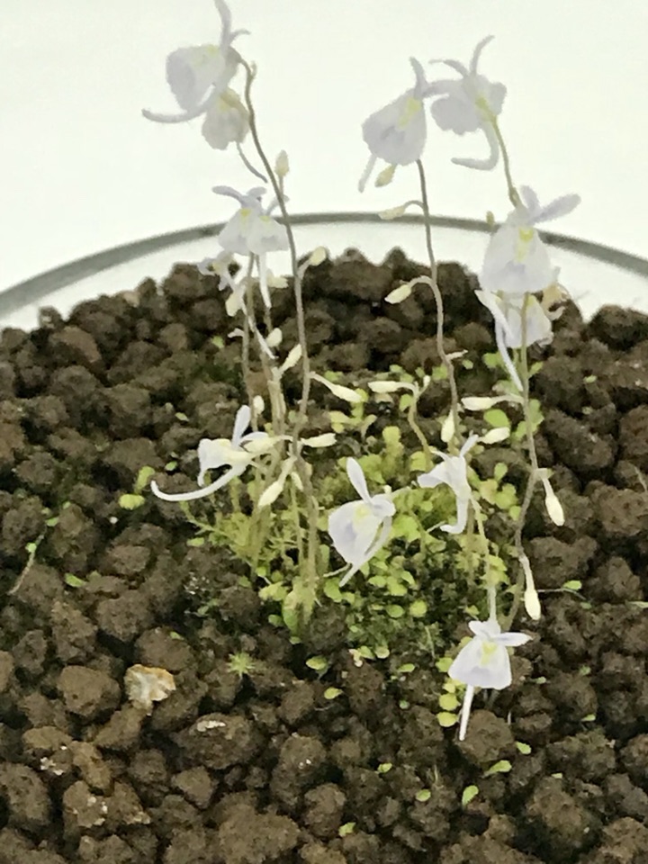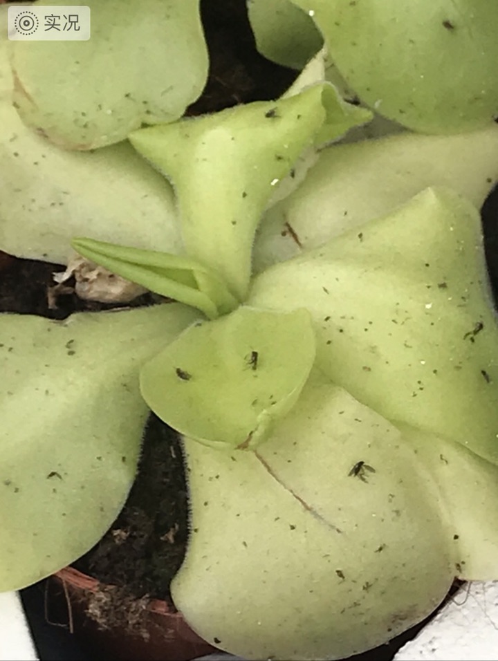 ▲捕虫堇,捕虫叶面有腺体,能分泌粘液粘住昆虫,叶缘稍向上弯。当昆虫被雨水冲至叶缘时,叶缘受到刺激即旋卷将虫体包裹起来,然后分泌消化液…,“饱餐”后恢复原样。