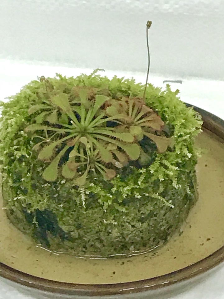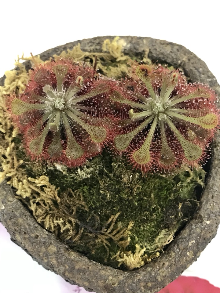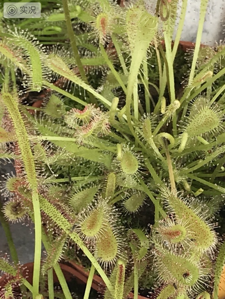 ▲茅膏菜也称毛毡苔,毛茸茸的晶莹剔透,捕虫叶圆形,叶片边缘密布能分泌黏液的腺毛,腺毛极其敏感,当昆虫落在叶面上,便被粘住,叶片随即向内和向下运动,名符其实的变态吧,将虫子紧紧地围裹起来,并逐渐消化,“饱餐一顿”后腺毛又恢复原状。