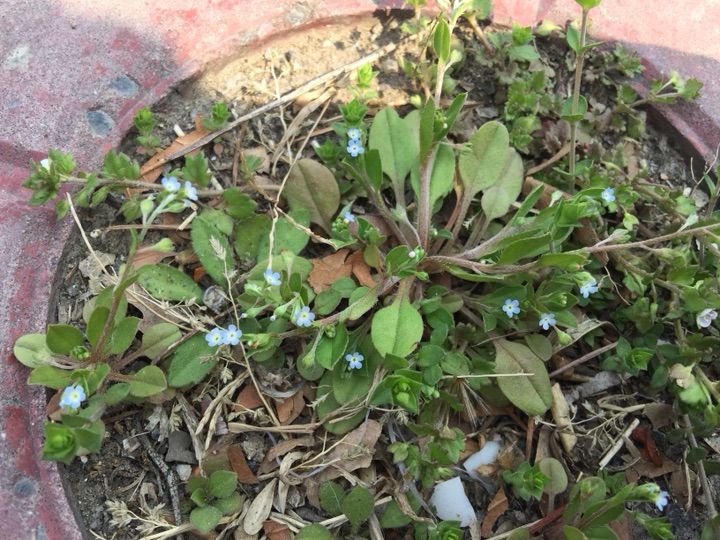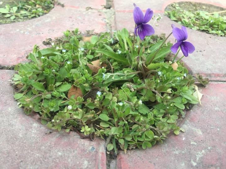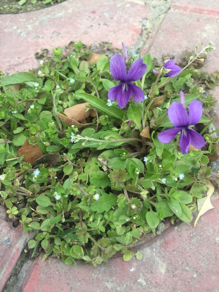 长在地砖空档中,天蓝色小小的阿拉伯婆婆纳和紫花地丁以及枯叶🍂