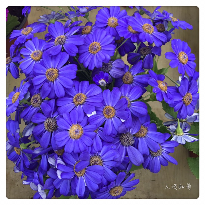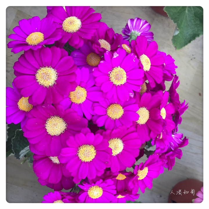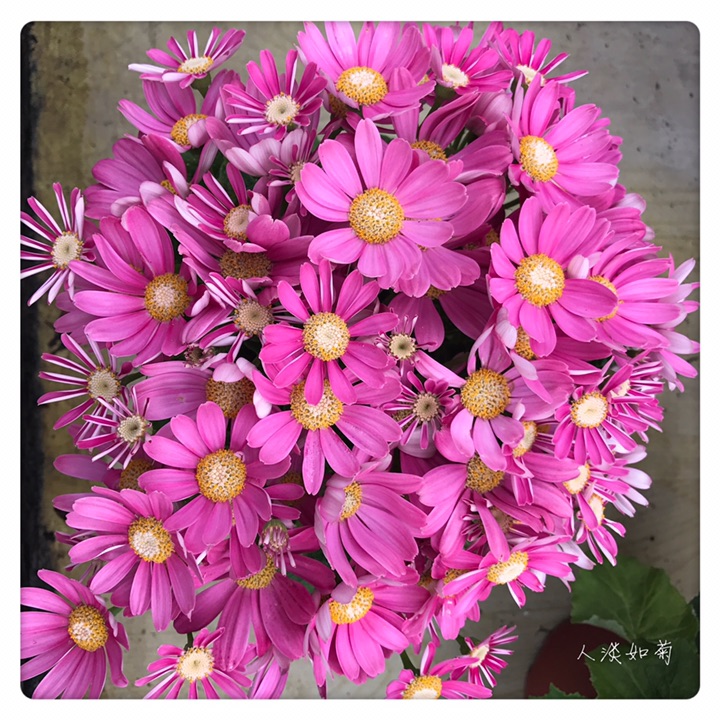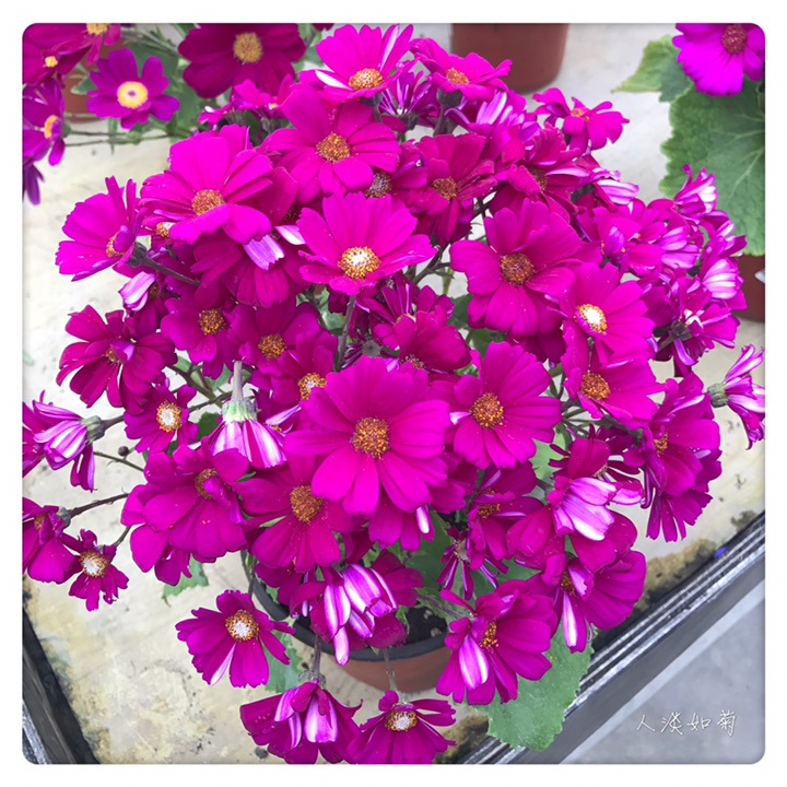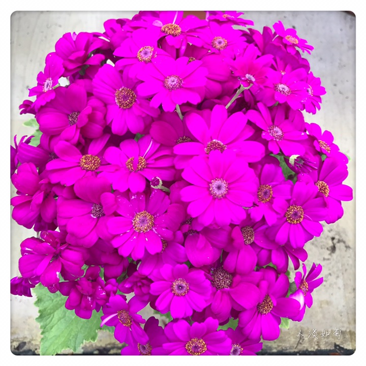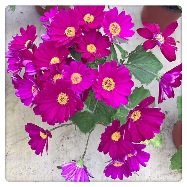 瓜叶菊(学名:Pericallis hybrida),别称富贵菊、黄瓜花。菊科瓜叶菊属多年生草本,常作1-2年生栽培。分为高生种和矮生种,20-90厘米不等。全株被微毛,叶片大形如瓜叶,绿色光亮。花顶生,头状花序多数聚合成伞房花序,花序密集覆盖于枝顶,常呈锅底形,花色丰富,除黄色其他颜色均有,还有红白相间的复色,花期1-4月。瓜叶菊的花语是:喜悦,快活,快乐,合家欢喜,繁荣昌盛。适宜在春节期间送给亲友,此花色彩鲜艳,体现美好的心意。