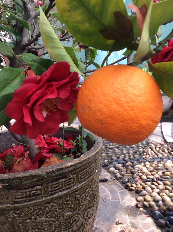 因为太酸,所以能让它在枝头挂了很久,从头一年的秋天挂到第二年的春天,和春天开的茶梅来了个“秋天的果春天的花”的组合。