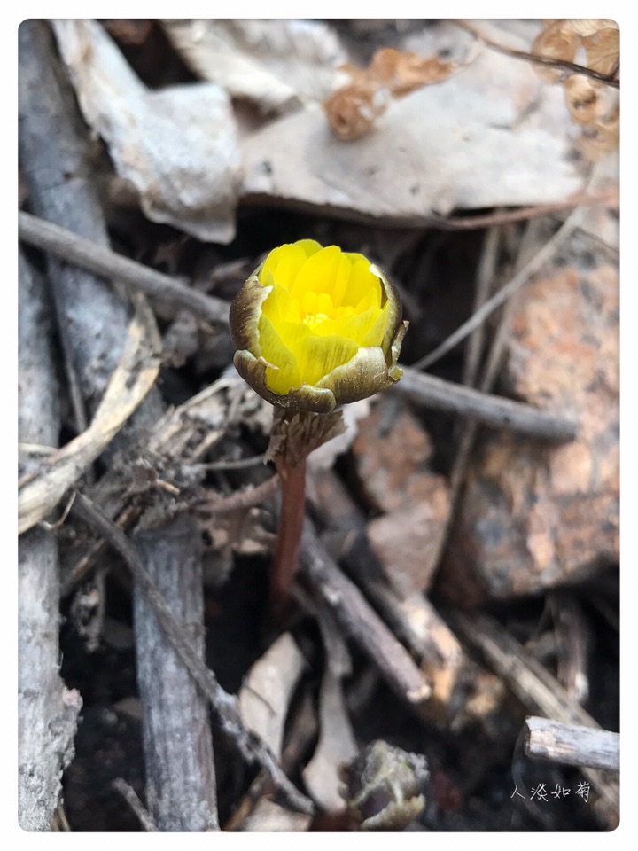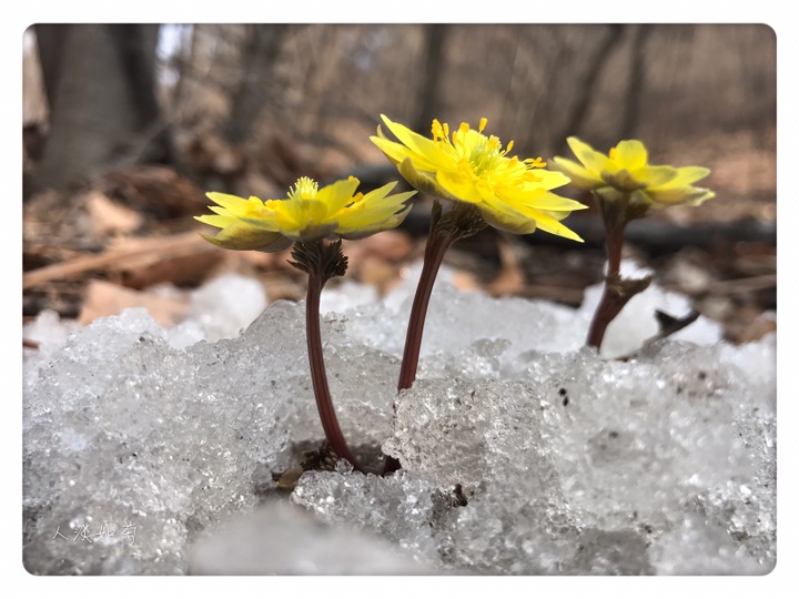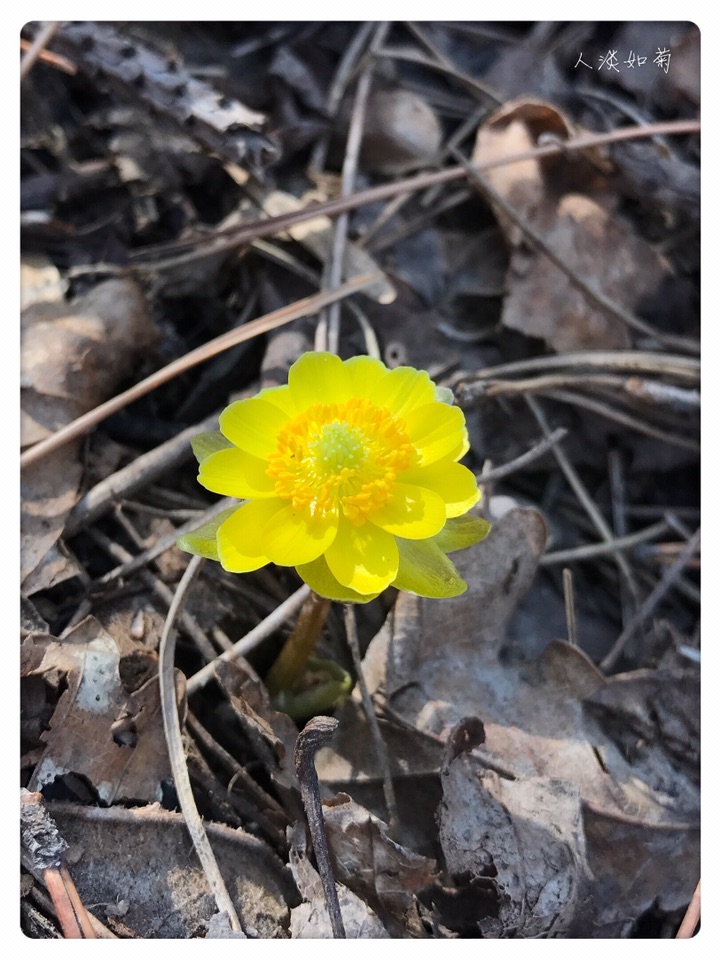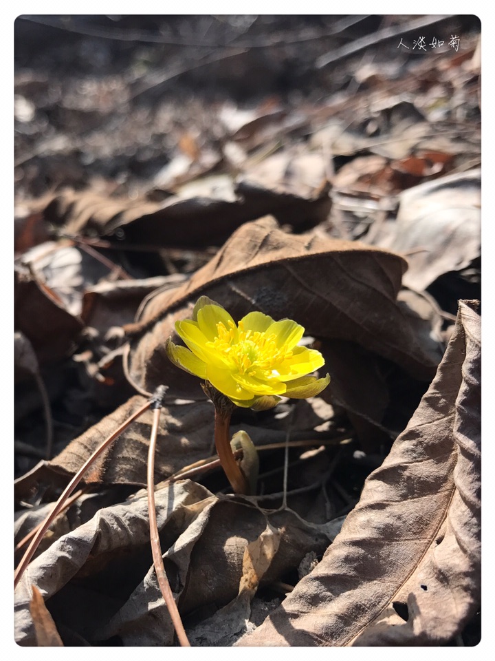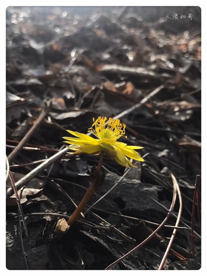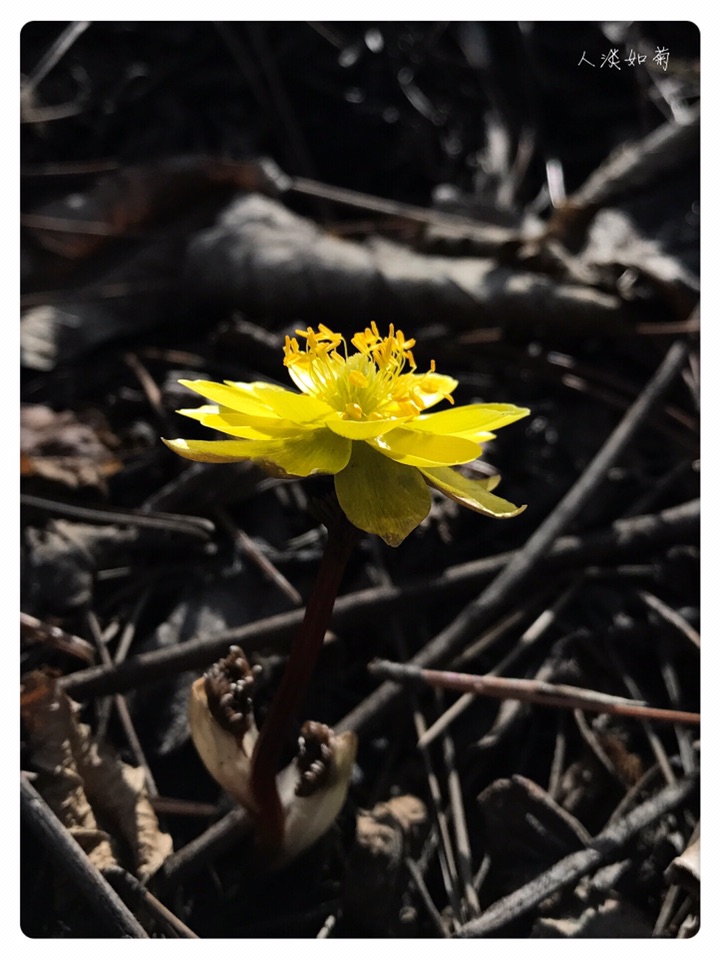 在千山落叶覆盖冰冻的山坡上,在草木依旧枯黄的季节里,一朵朵金黄色的侧金盏花向着明媚的阳光,尽情地绽放在东北这早春时节,不畏严寒,不与百花同放,在冰雪中凸显其圣洁和顽强。