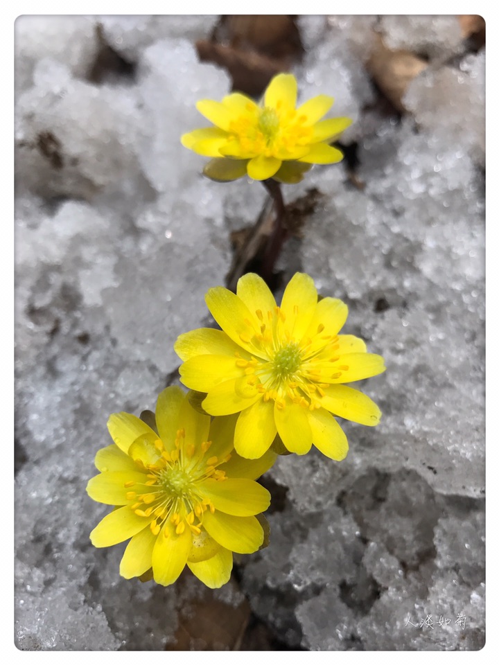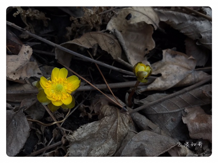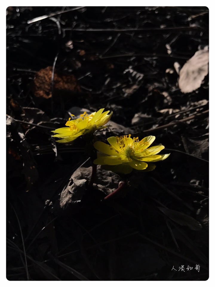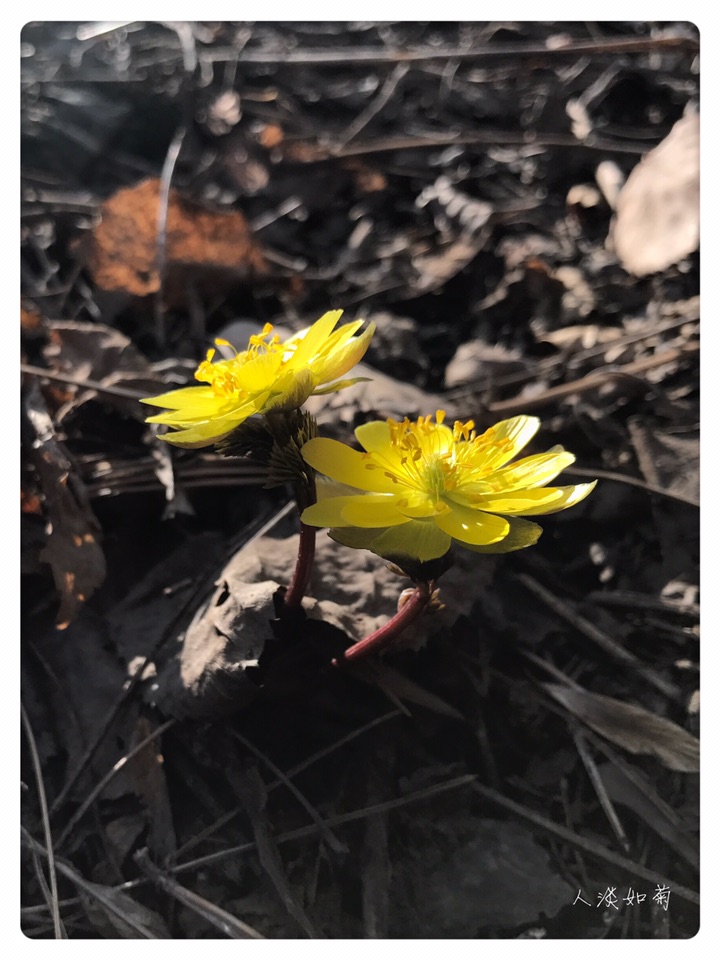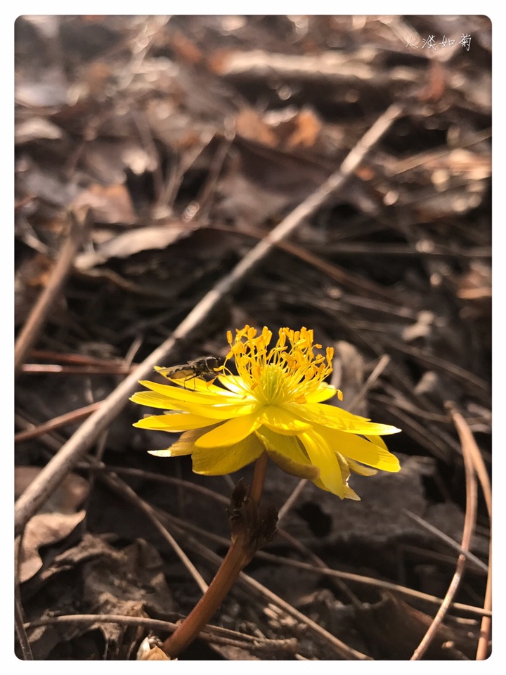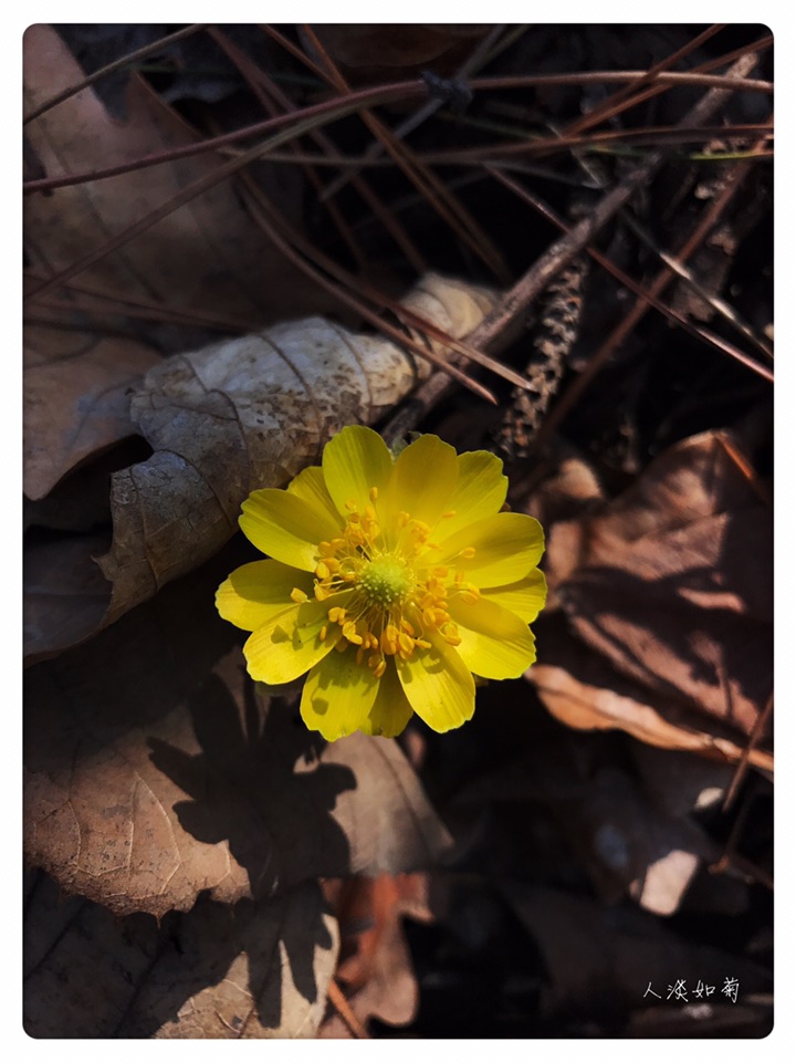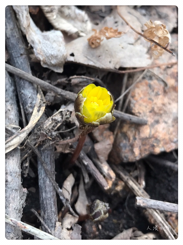 在千山落叶覆盖冰冻的山坡上,在草木依旧枯黄的季节里,一朵朵金黄色的侧金盏花向着明媚的阳光,尽情地绽放在东北这早春时节,不畏严寒,不与百花同放,在冰雪中凸显其圣洁和顽强。