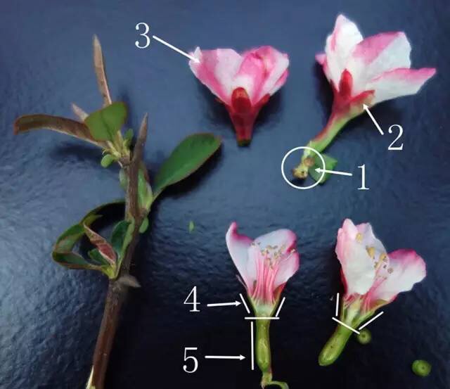 1.花梗颜色 2.花梗长度 3.萼片长度 4.萼筒长度