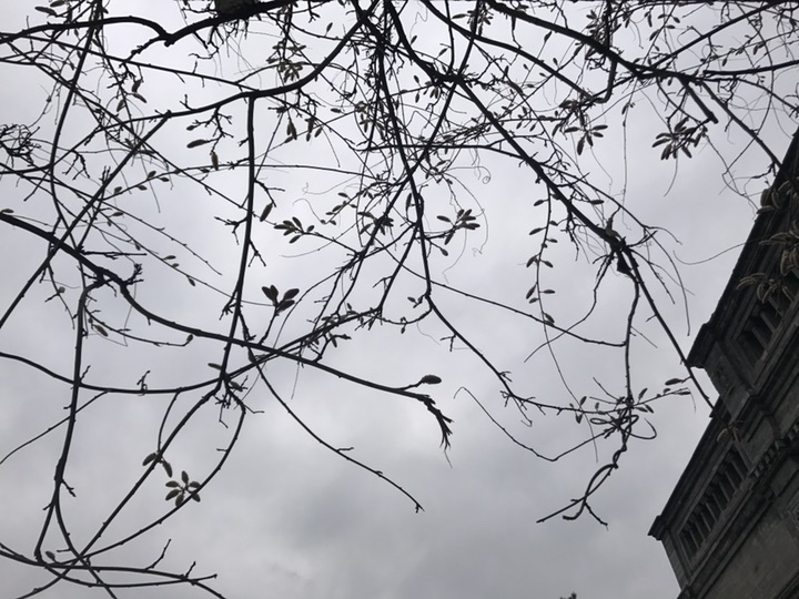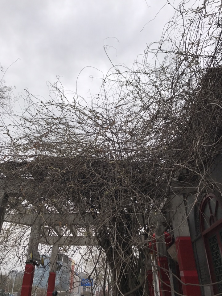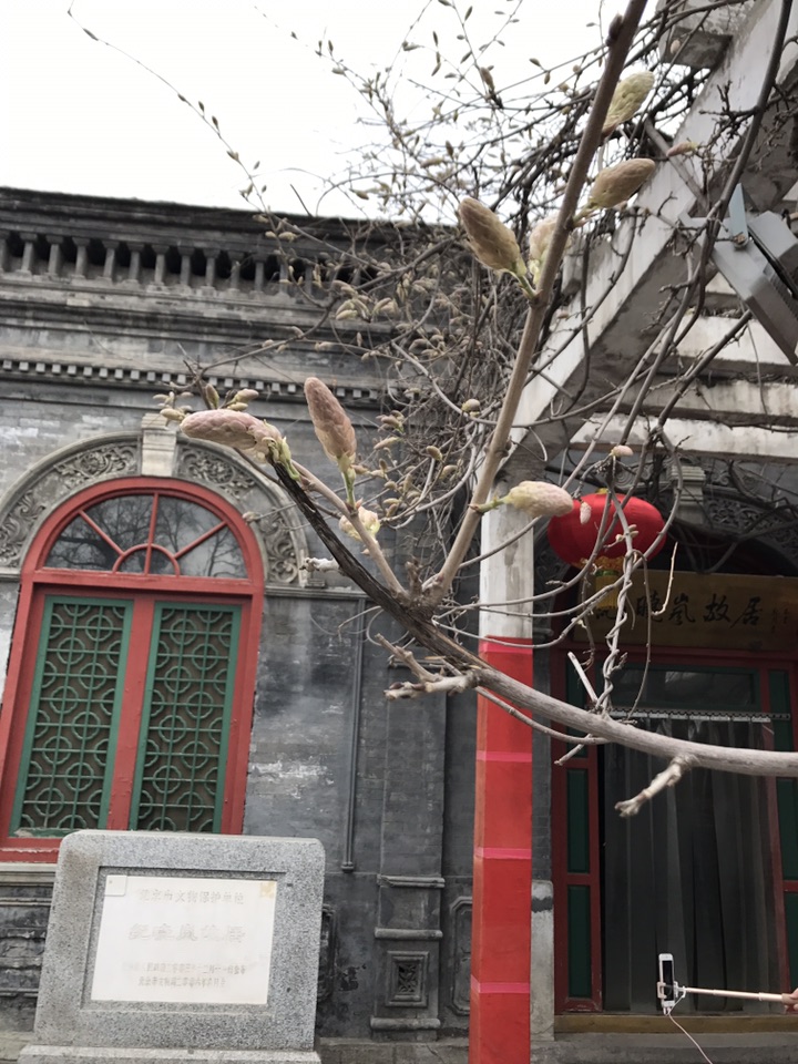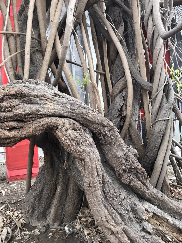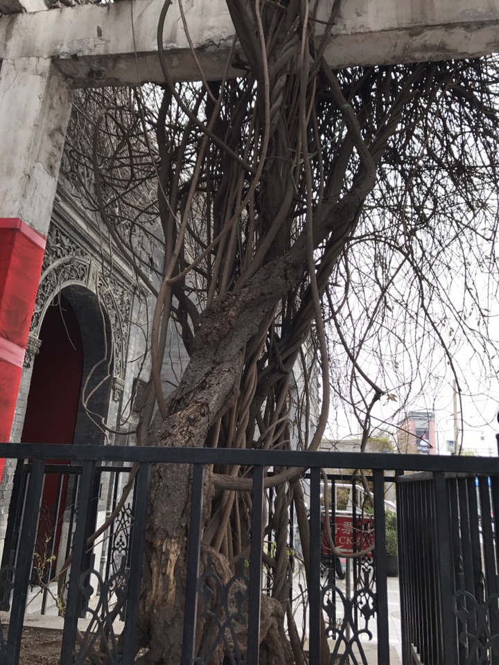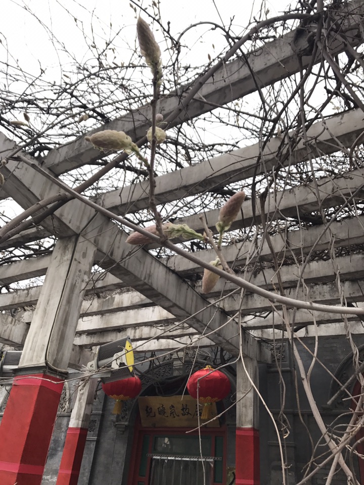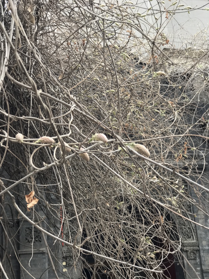 临街而立的藤萝树,只见它枝干虬曲,树皮灰白,显然还没有完全从冬寒中恢复过来。虽说已有了些许的花苞,可对于春天的感知还是后知后觉。这棵紫藤据说正由纪晓岚亲手种植,原来身处两进院落的深闺之中,如今因为前面的房子已拆,所以被迫裸露于街边了。但别看它这副萎靡不振的样子,据说到了花期又会枝繁叶茂、花香四溢、惊艳来往 ……