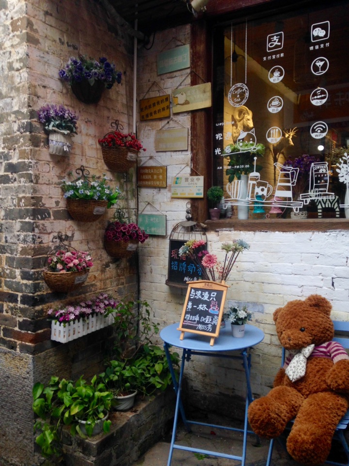 几盆精巧的花,泰迪的目光,却总是望向远方。咖啡店里透出的,是不尽的浪漫