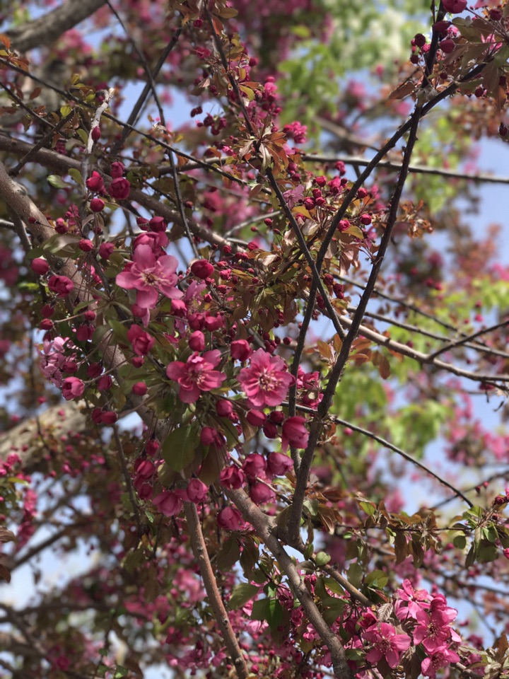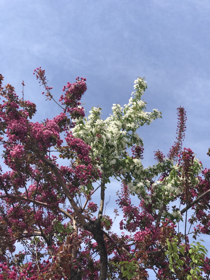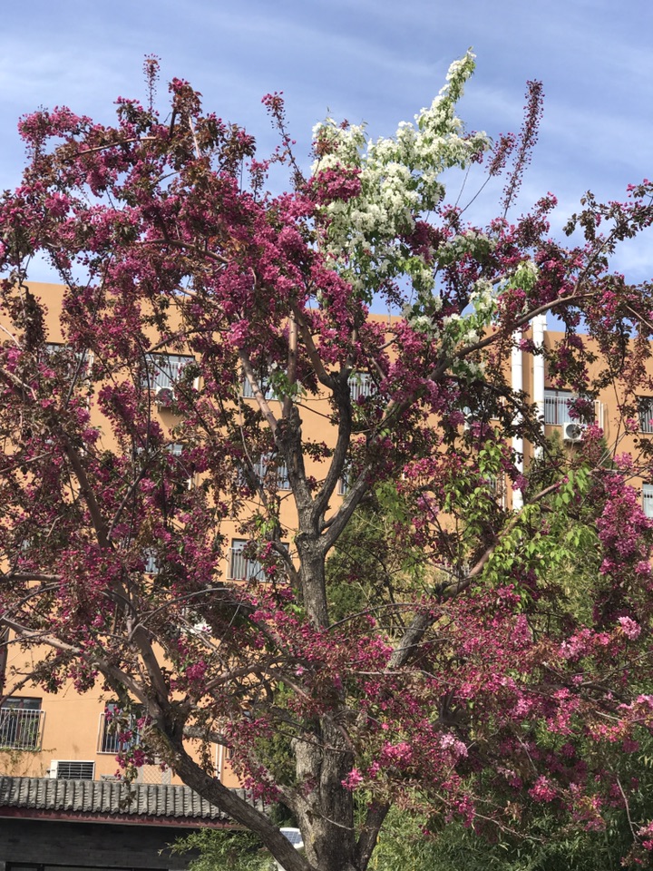 这是万寿公园里的一株海棠,树形高大。花枝繁茂,远远的便看到了对比鲜明的一紫一白,还想着大树后面还藏着一棵树吗?走近一看原来就是一棵,只是树梢处有两枝白色海棠夹杂其中。这应该是嫁接的吧?都说大树底下好乘凉,树下的长椅上坐满了闲聊的老头儿老太太,一边闲话家常一边赏花闻香