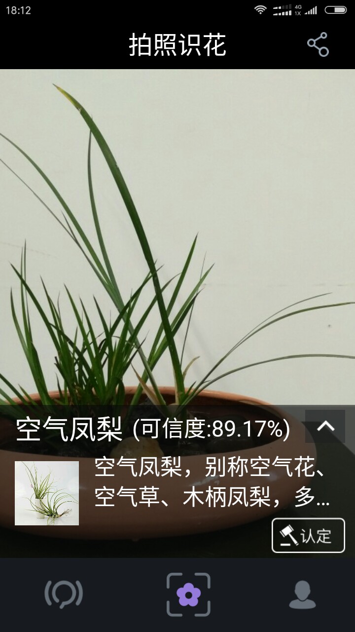 第一回是下了一个“拍照识花”的APP,一试,很是失望,上传的照片它识是能识,也能报出花名,但遗憾的是花名大多是错的,比如,把石菖蒲鉴定为“空气凤梨”,还备注可信度89.17%,噢麦疙,这是哪来的自信?